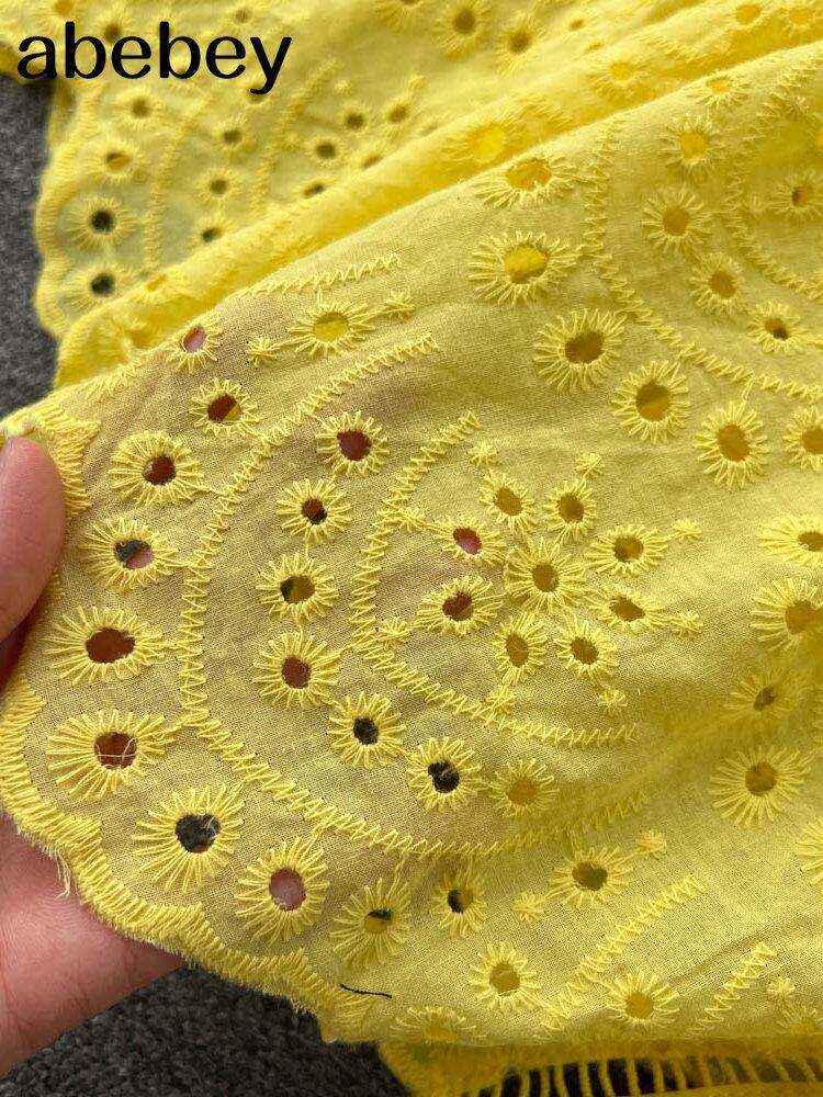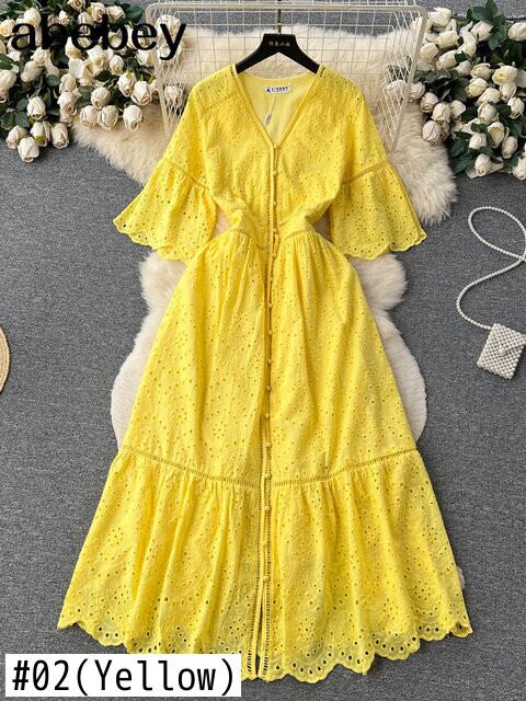 ホワイト/イエローサマーレース刺繍ドレス半袖ドレスパーティービーチマキシロングドレス ショート ハーフスリーブ 夏物