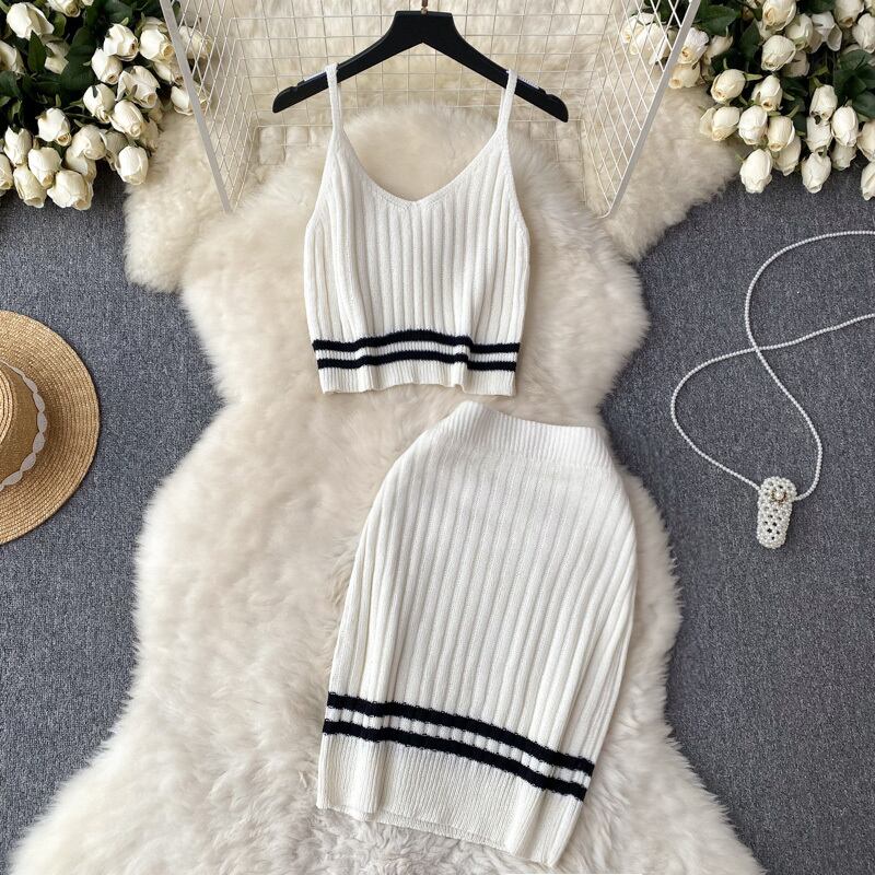 夏ニットツーピーススーツ中空アウトストラップトップ + 弾性ウエストボディコンスカートストリートシニアセット エラスティック 伸縮 サマー 夏物