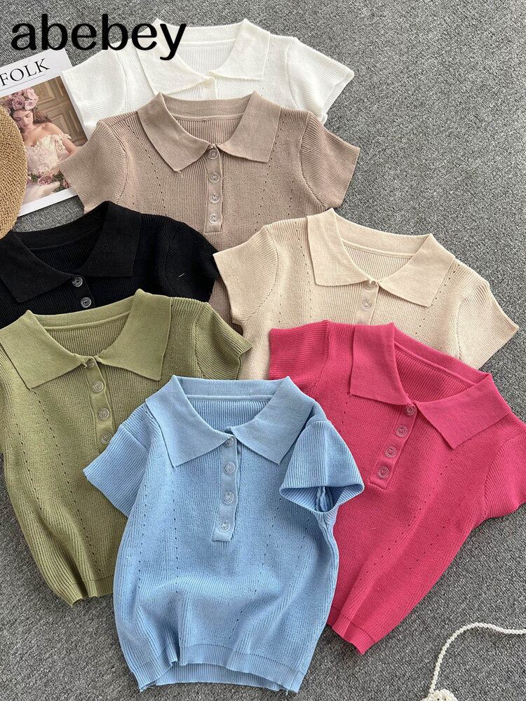 ソリッドニットクロップトップ夏ターンダウン中空アウト生き抜くスリムビーチスタイルトップス サマー 夏物 ソリッドカラー