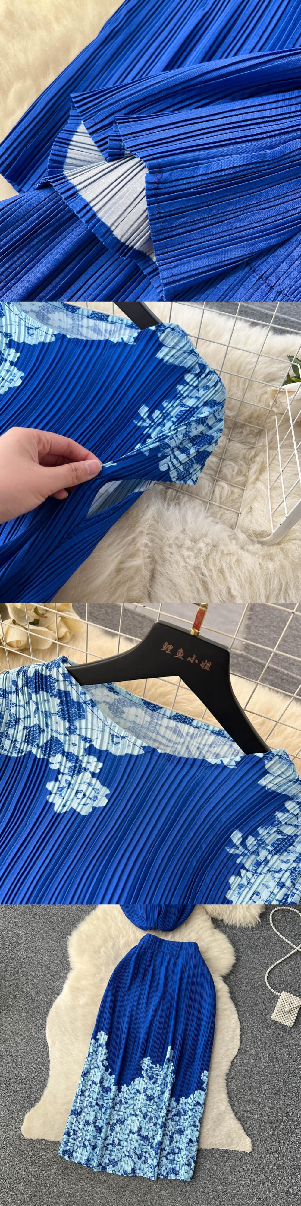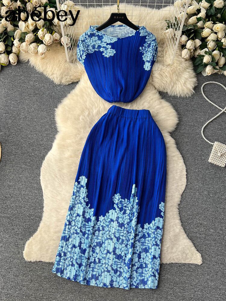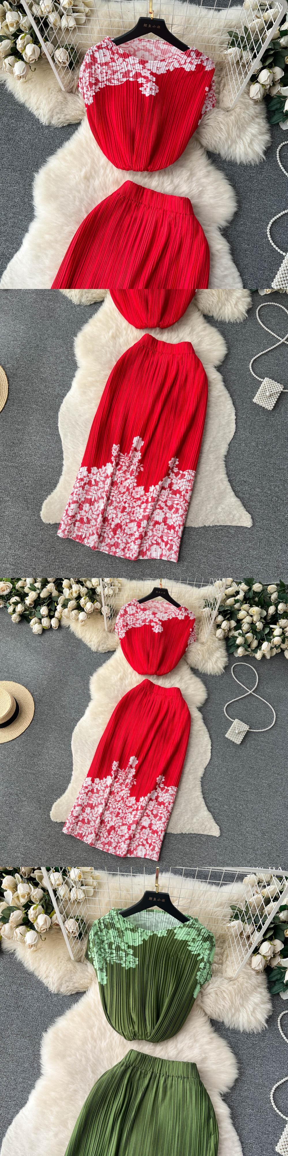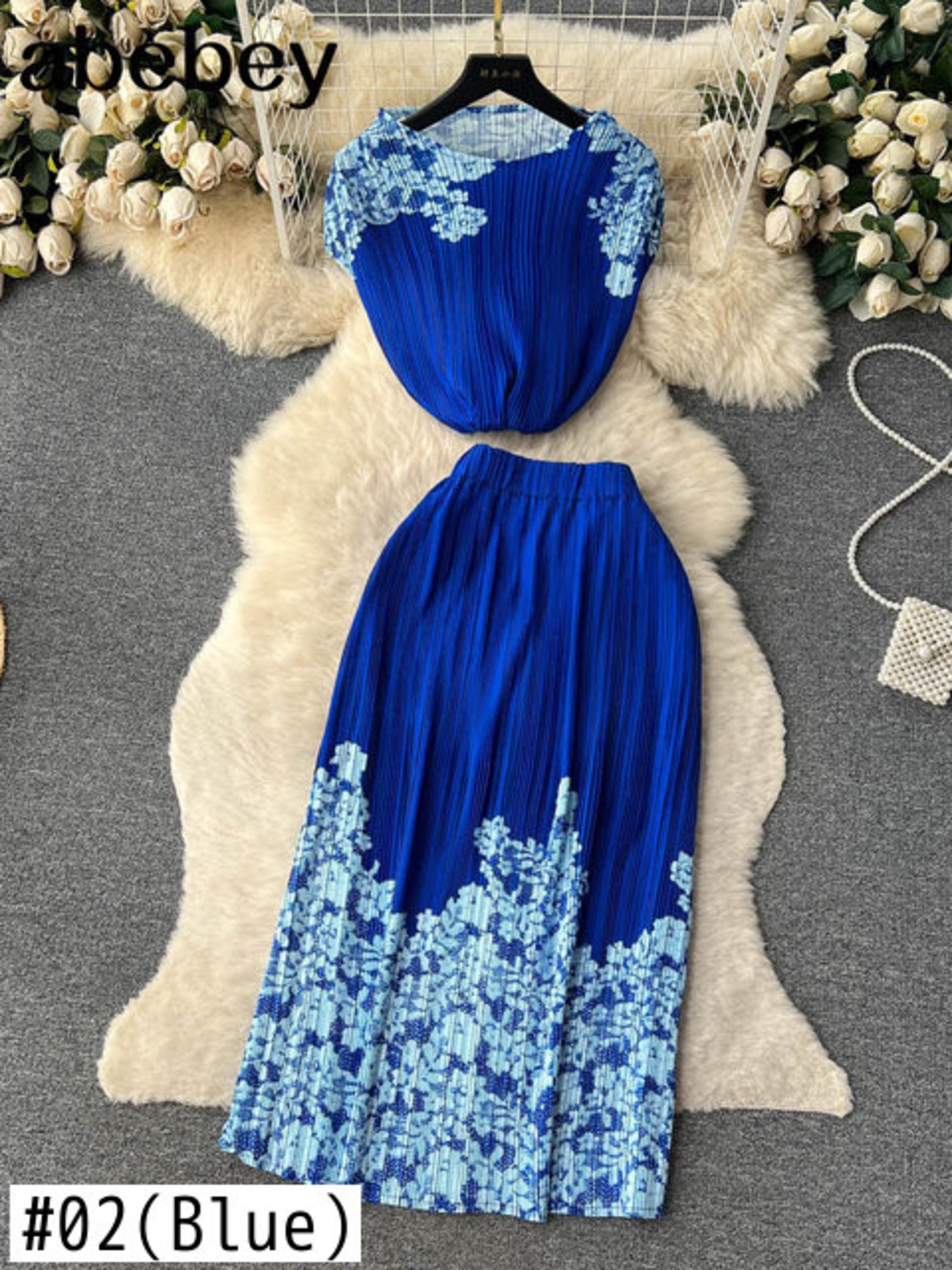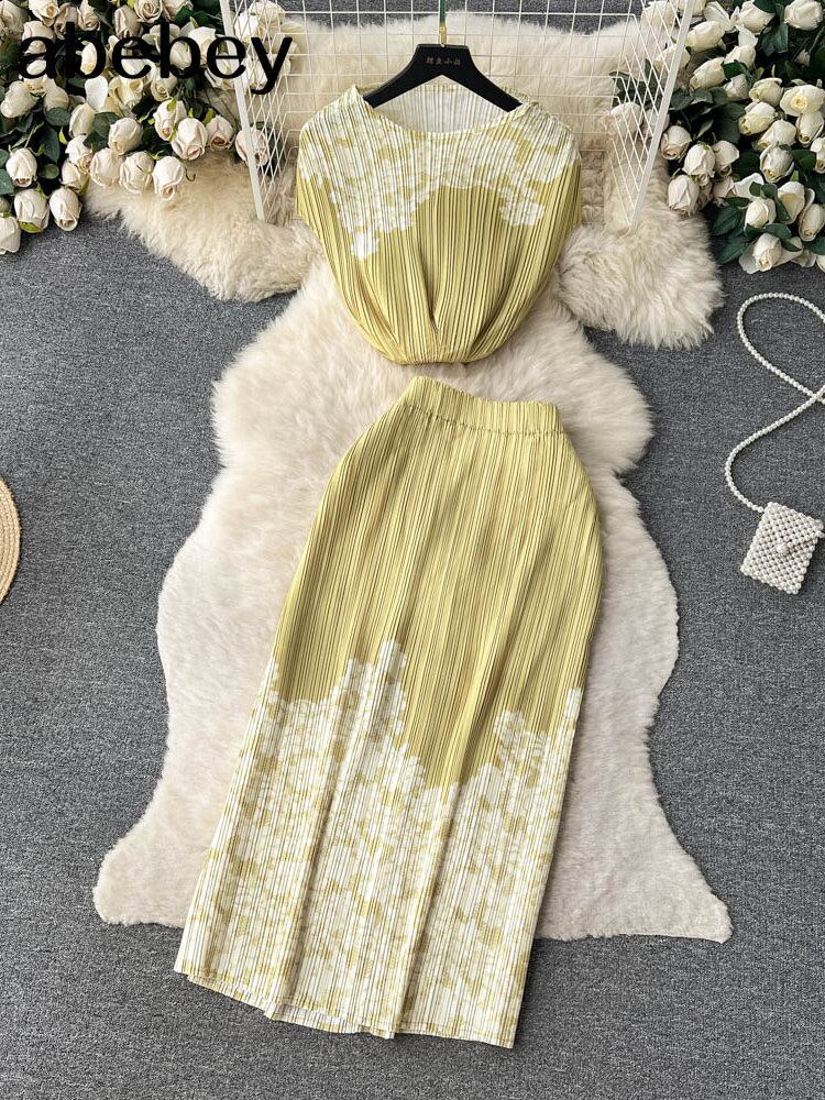 夏ルーズ 2 魚座スーツ O ネックノースリーブトップ + ウエストプリーツスカートストリートセット サマー 夏物 Oネック