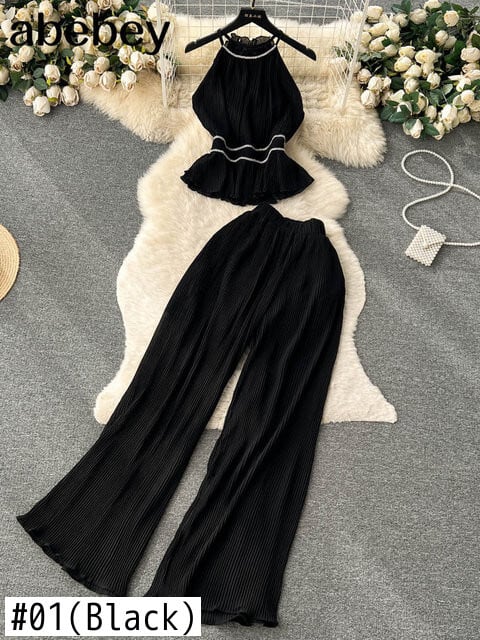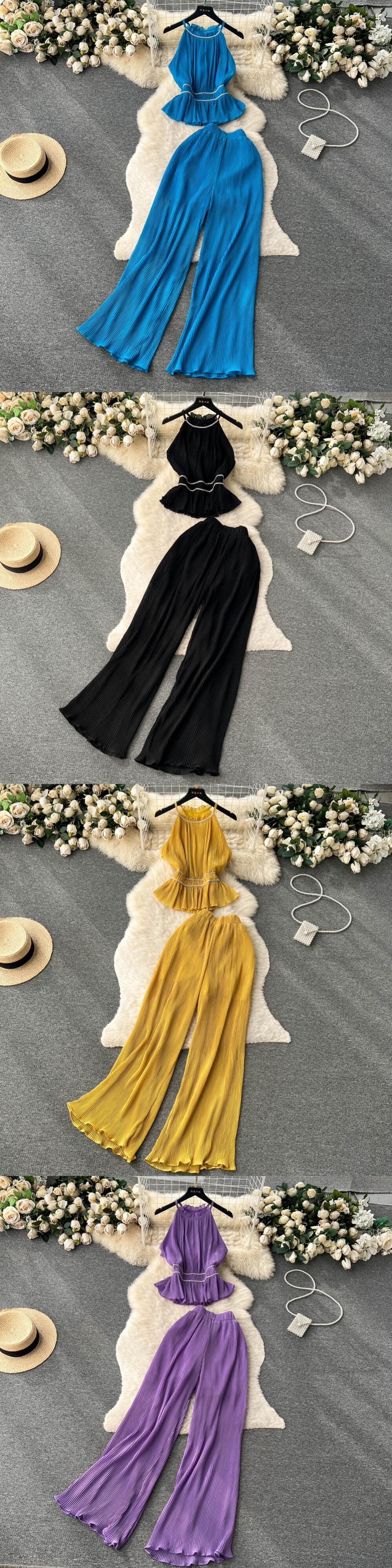 ストリートセクシーツーピーススーツストラップ背中開いたキャミソール+ワイドレッグロングパンツセット夏プリーツルーズビーチセット サマー 夏物 ワイドパンツ