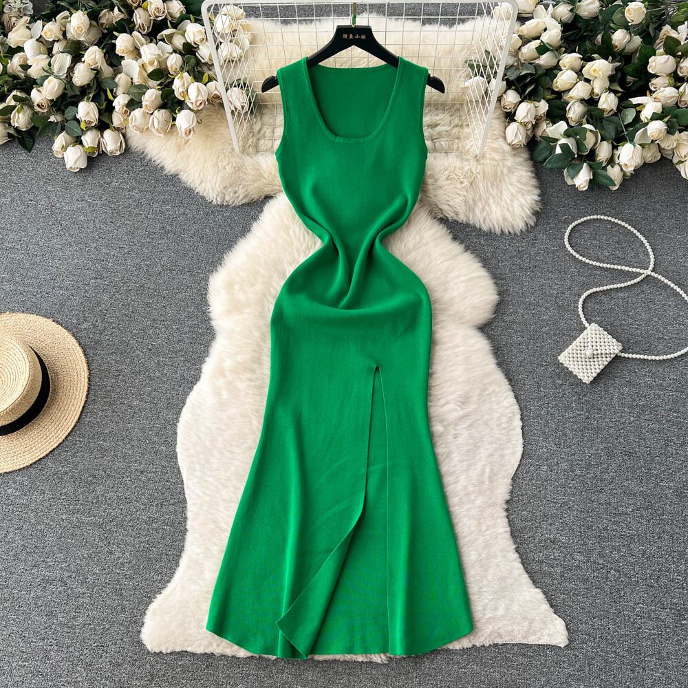 サマーニットセクシーストラップドレスタンク弾性ウエストボディコンサンドレスビーチスプリットバックレスロングドレス 夏物