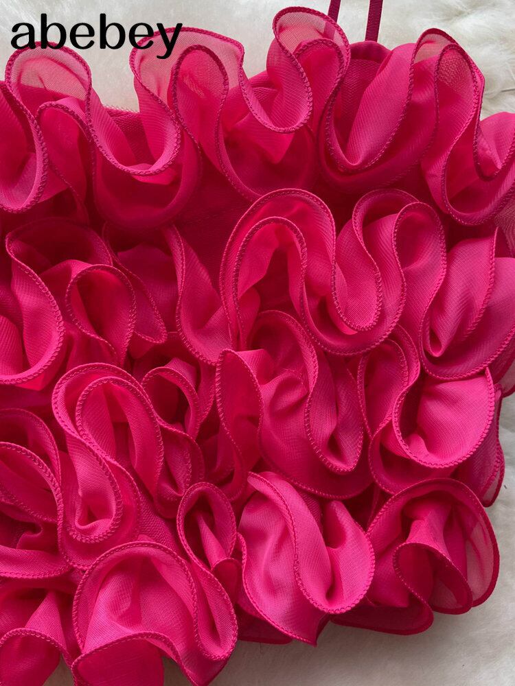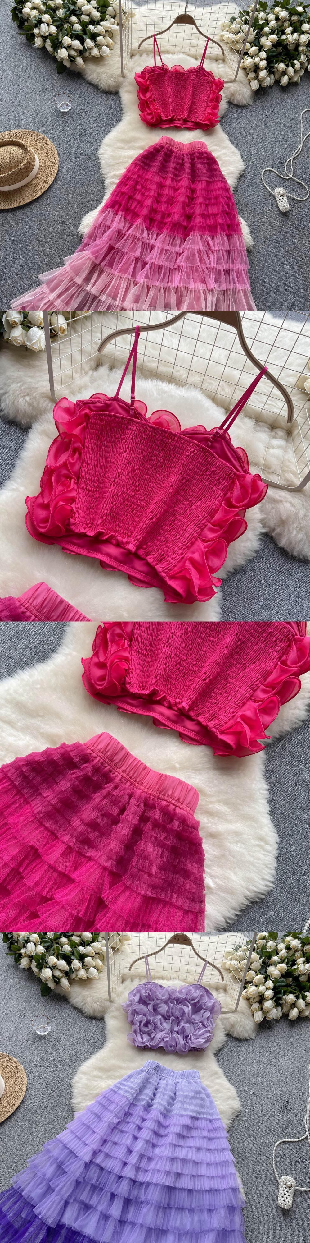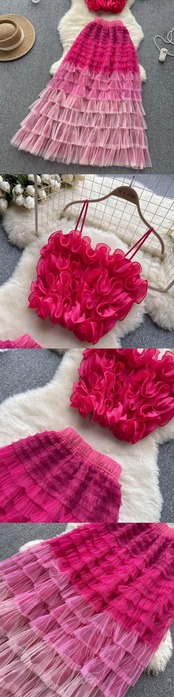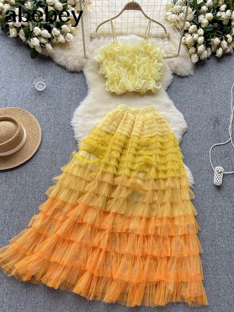 メッシュシアービキニカバーアップセットキャミソールクロップトップとケーキフリルロングスカートツーピース水着ビーチドレス ラッフル