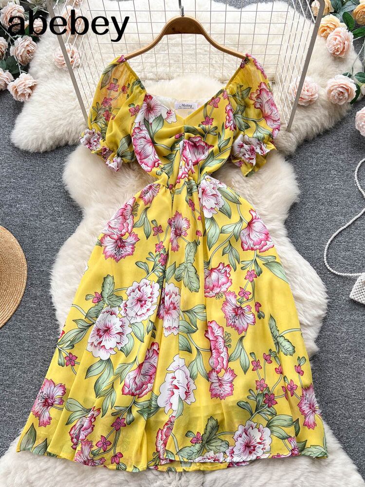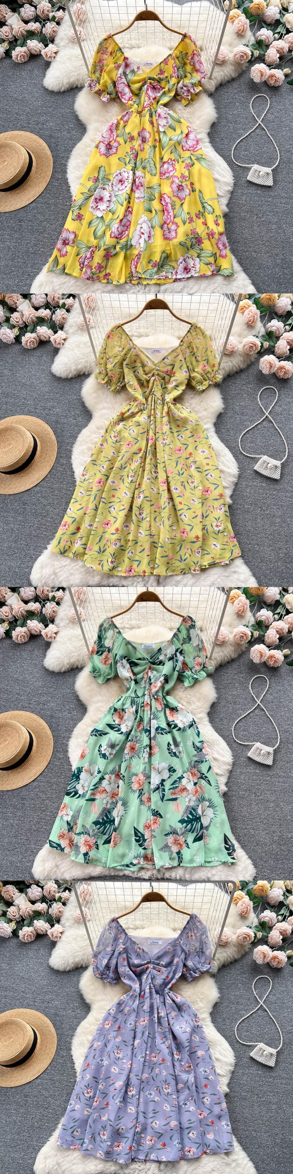 フレンチスタイルシフォン花柄ロングドレス夏 V ネック半袖 Elatsic A ラインプリーツプリントビーチ Sudress ショート ハーフスリーブ サマー 夏物 Vネック Aライン