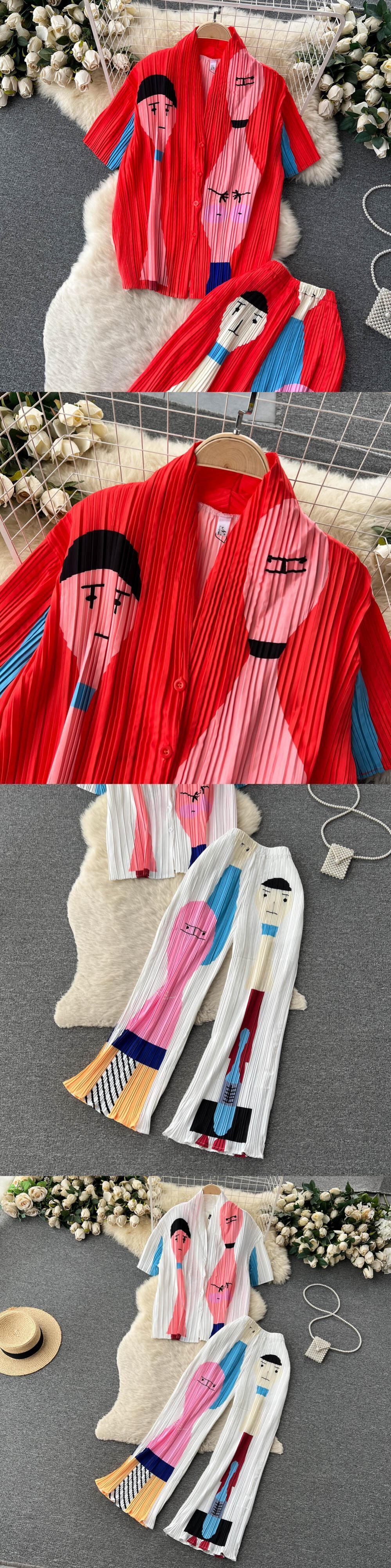 夏ルーズ 2 魚座スーツ O ネックノースリーブトップ + ウエストプリーツロングパンツストリートセット サマー 夏物 Oネック