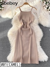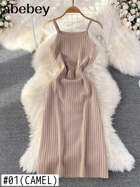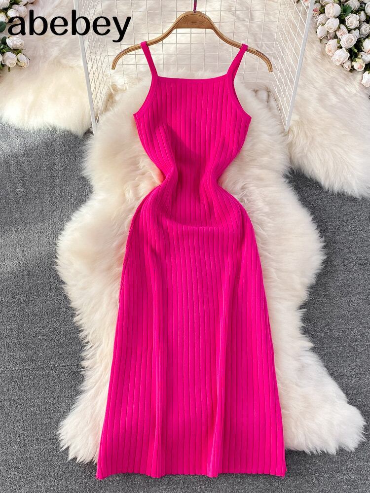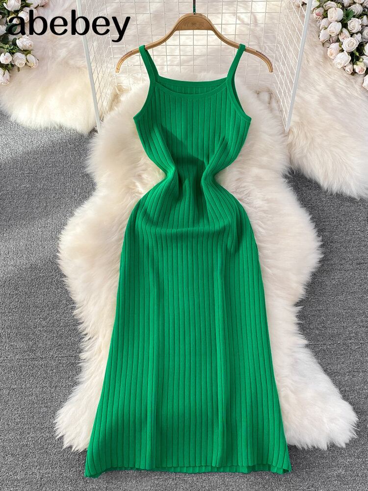 グリーンサマーニットセクシーストラップドレスタンク弾性ウエストボディコンサンドレスビーチAラインバックレスロングドレス 夏物