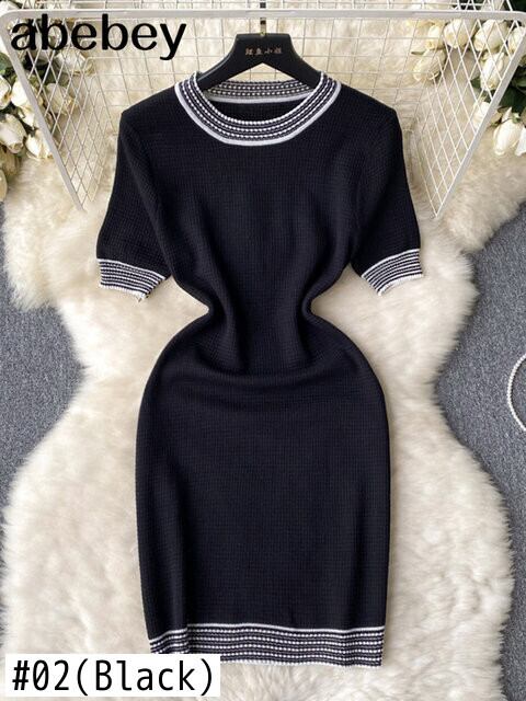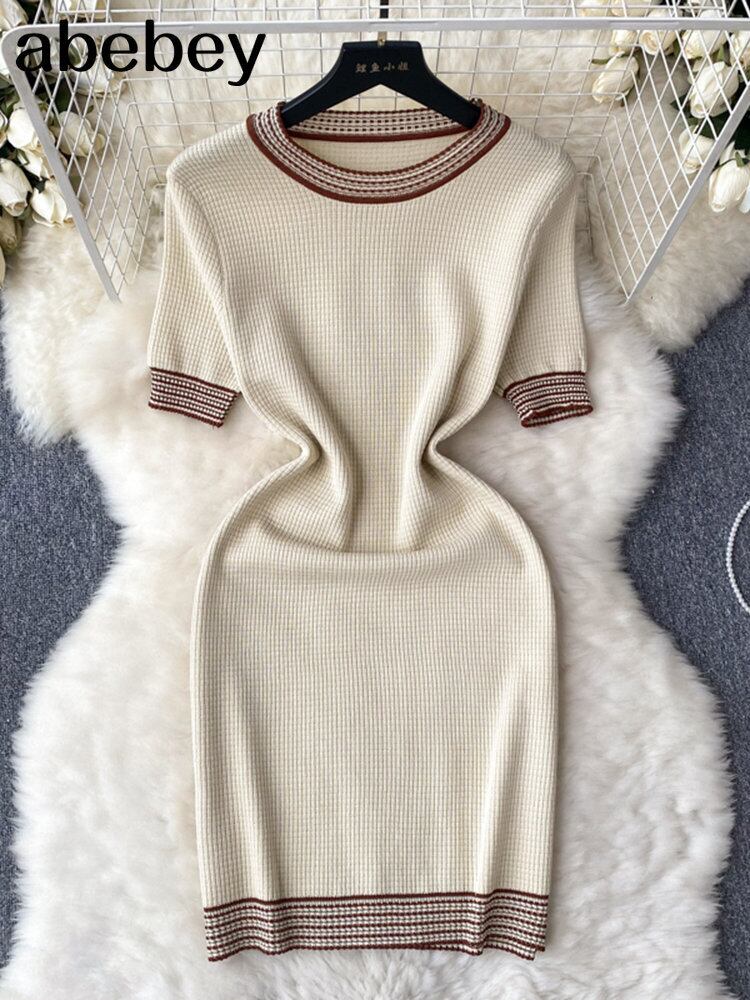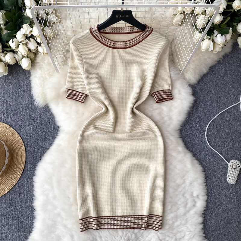 ストリップセクシーサマーニット半袖ドレス O ネックウエストボディコンサンドレスビーチショートミニドレス ハーフスリーブ 夏物 Oネック