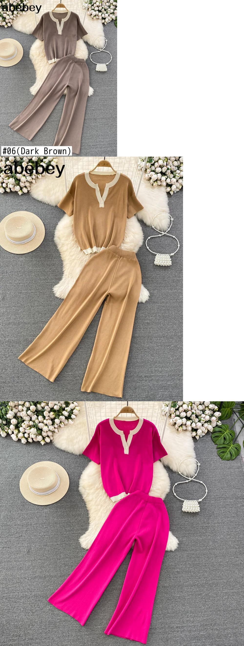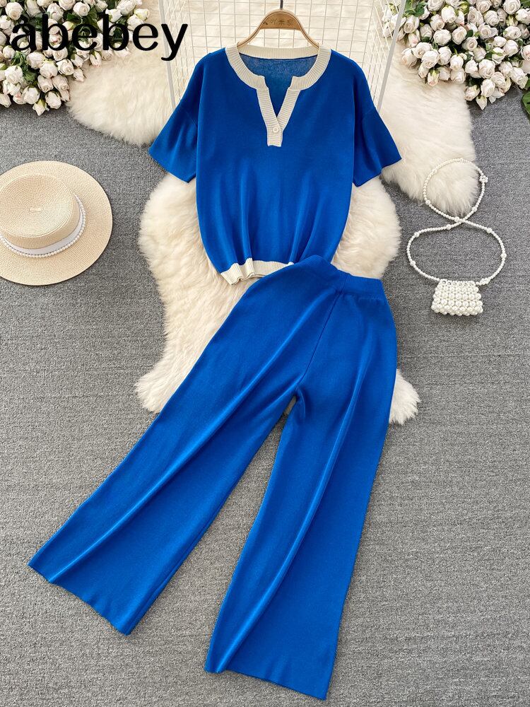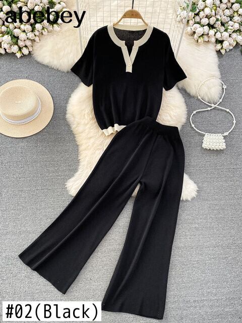 パンツ 2 点セット夏 v ネック半袖ニットトップスウエストワイドレッグロングパンツトラックスーツ ショート ハーフスリーブ サマー 夏物 Vネック ワイドパンツ