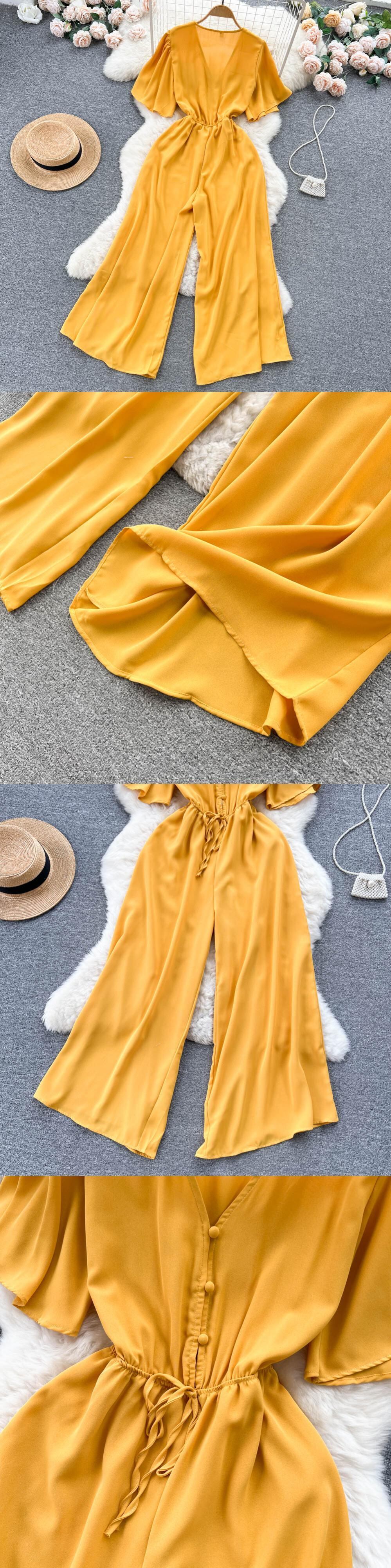 夏ロンパース V ネックショートフリル袖ウエストワイドレッグボウストリートジャンプスーツ リボン ラッフル サマー 夏物 Vネック ワイドパンツ ソリッドカラー