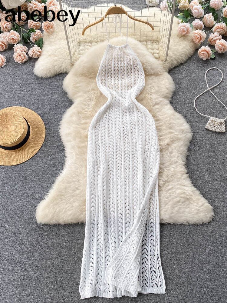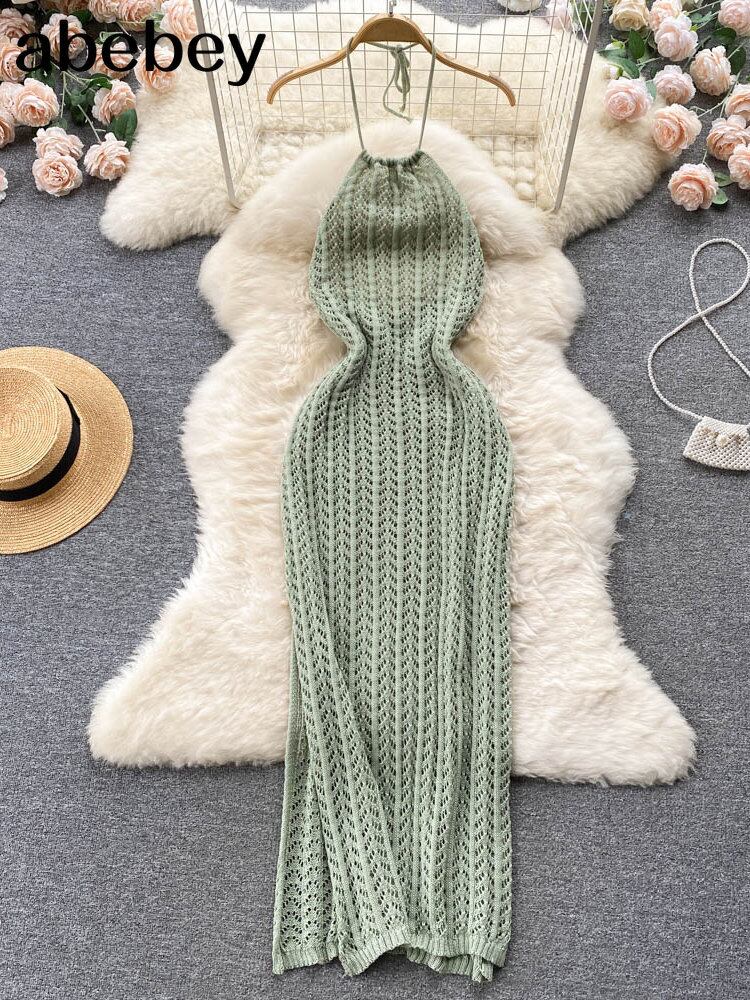 ホルターサマーニットセクシーストラップドレス中空アウトスプリット弾性ウエストボディコンサンドレスビーチ背中開いたロングドレス 夏物