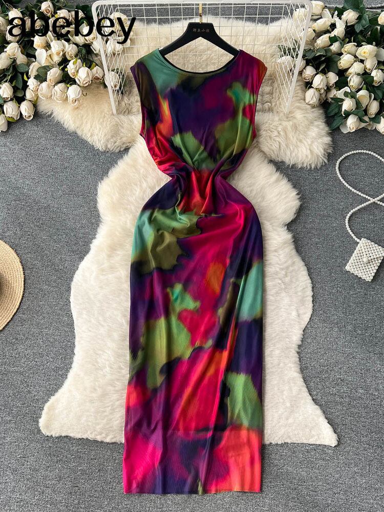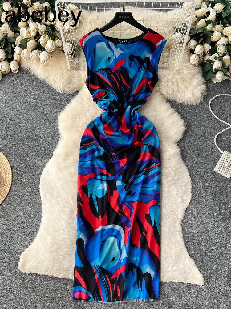 ファッションネクタイダイドレス o ネックノースリーブボタンジッパープリントセクシー優しいストリートボディコンミディドレス Oネック