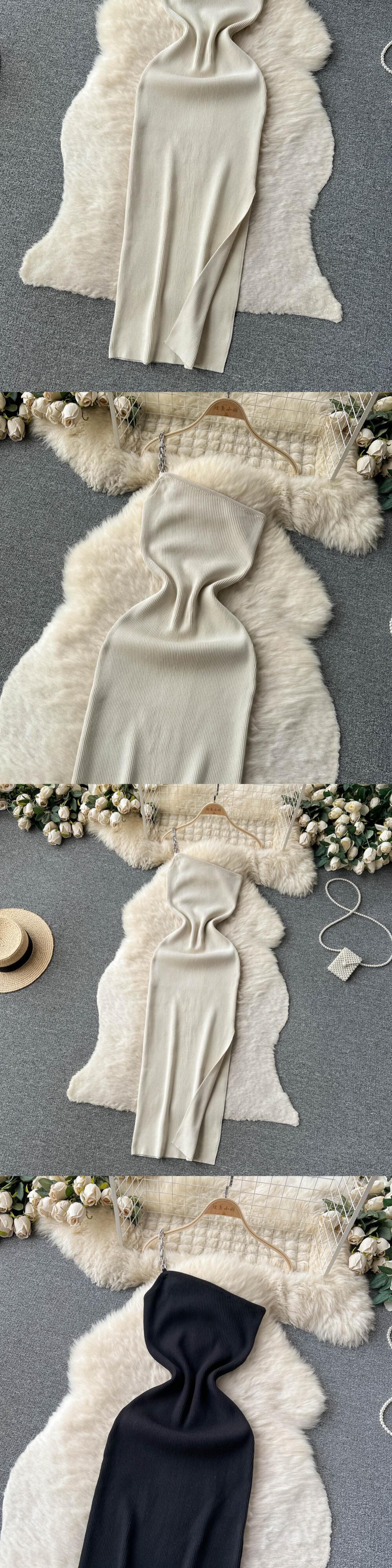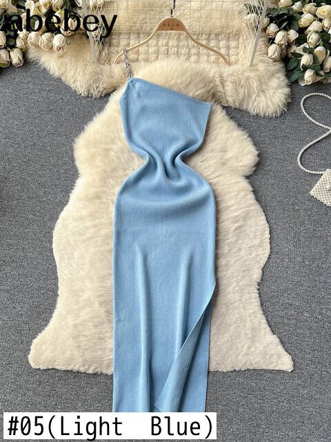 チェーンサマーニットセクシーストラップドレスワンショルダー弾性ウエストボディコンサンドレスビーチスプリットバックレスマキシロングドレス 夏物
