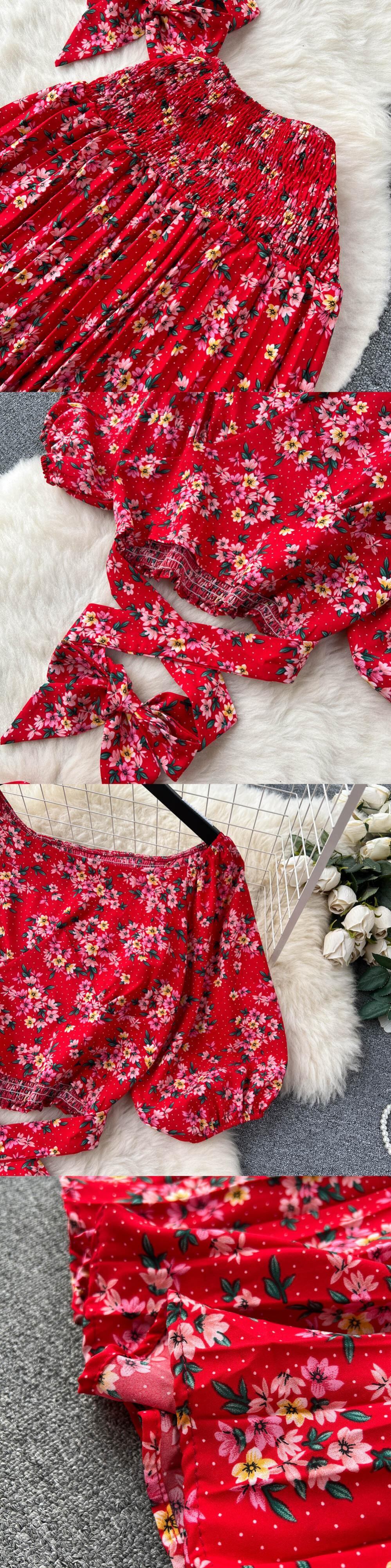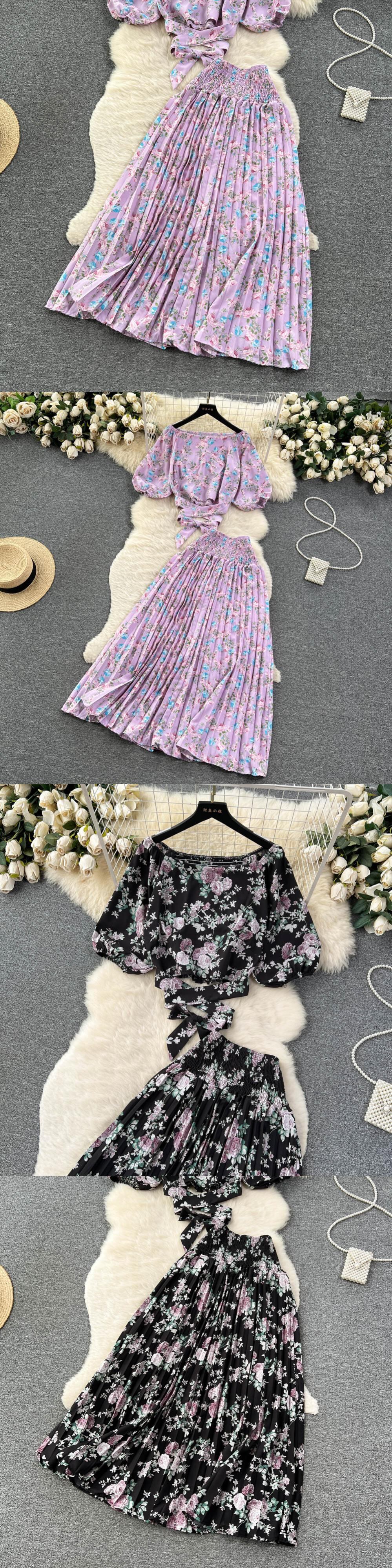 シフォン休暇ボヘミアンツーピーススーツ夏レースアップトップ + ロングスカートセット Y2K 花柄ビーチセット サマー 夏物