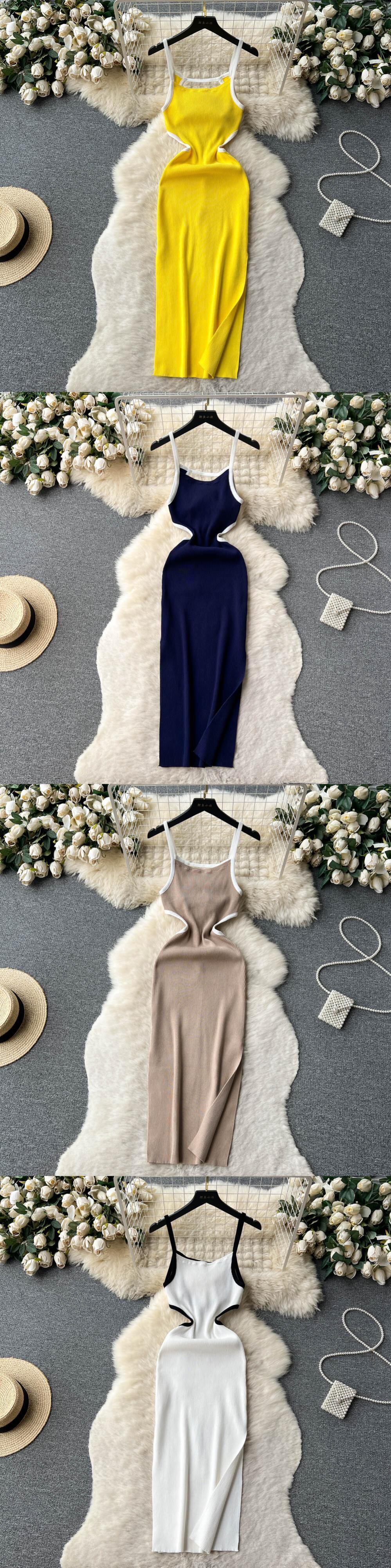 ホルターサマーニットセクシーストラップドレスタンク弾性ウエストボディコンサンドレスビーチスプリットバックレスロングドレス 夏物