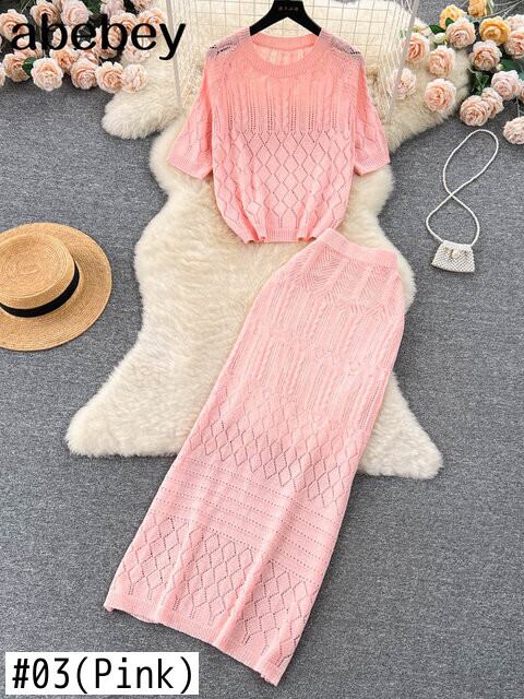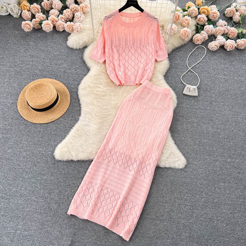 夏ルーズビーチスーツ O ネック半袖 T シャツ + A ラインロングスカート中空アウト 2 枚セット ショート サマー 夏物 Oネック Tシャツ