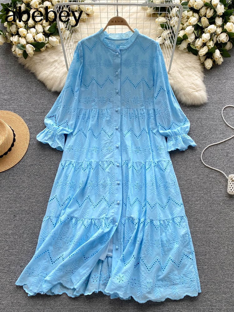 ホワイト/グリーン/ブルーサマーレース刺繍ドレス長袖ドレスパーティービーチマキシロングドレス 夏物