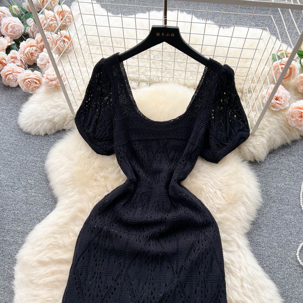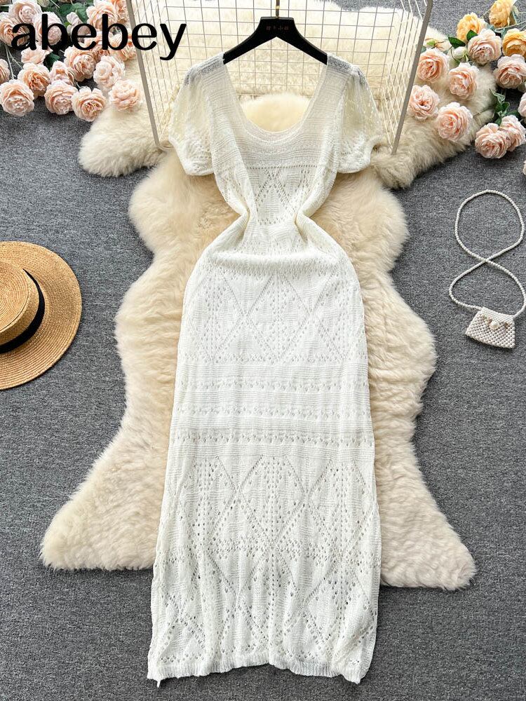 セクシーニットビーチドレス中空アウト O ネック半袖ドレス夏シースルーホワイトホリデー Vestidos ショート ハーフスリーブ サマー 夏物 Oネック