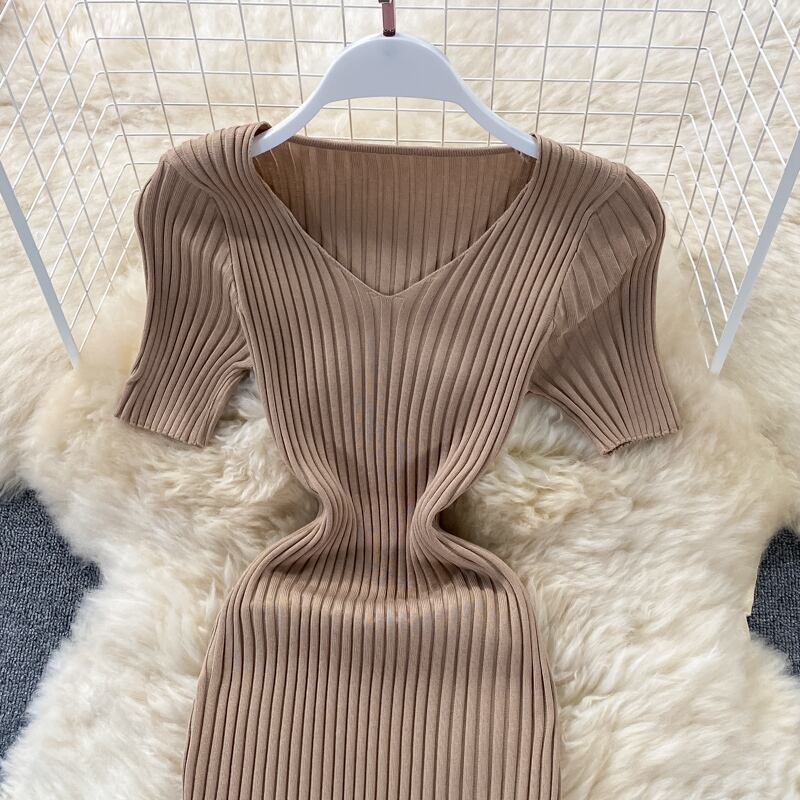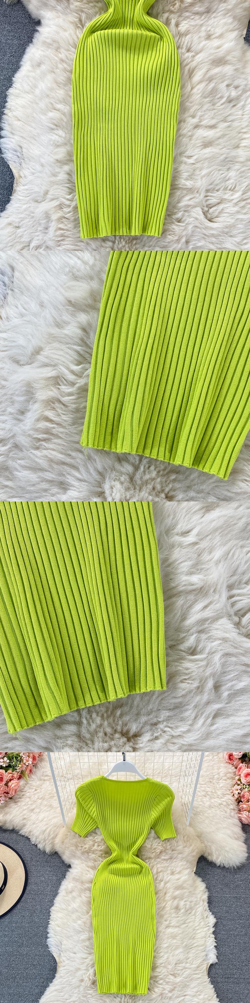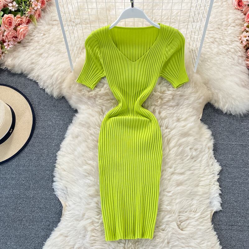 グリーンセクシーサマーニット半袖ドレス V ネックウエストボディコンサンドレスビーチショートミニドレス ハーフスリーブ 夏物 Vネック