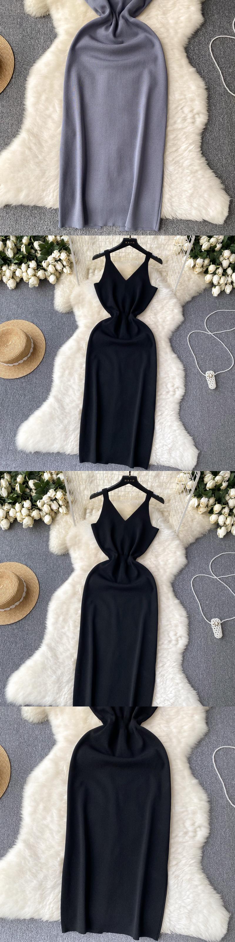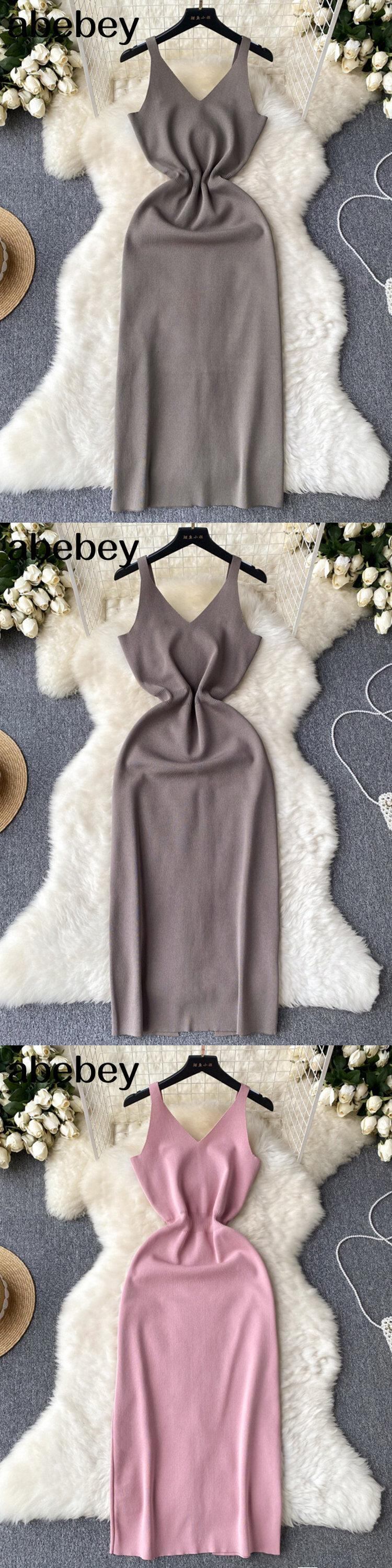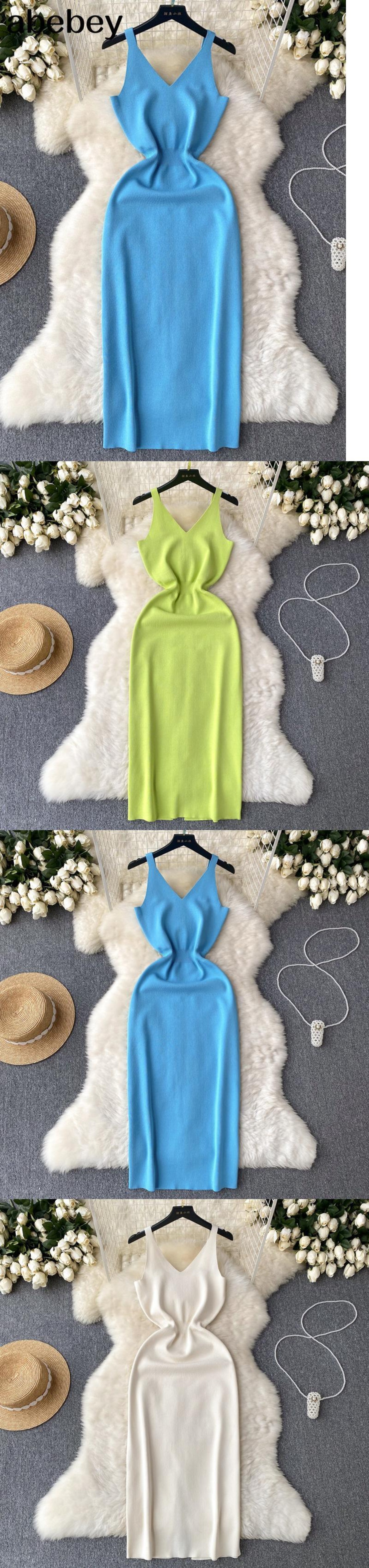 V ネックサマーニットセクシーストラップドレスタンク弾性ウエストボディコンサンドレスビーチスプリットバックレスロングドレス 夏物