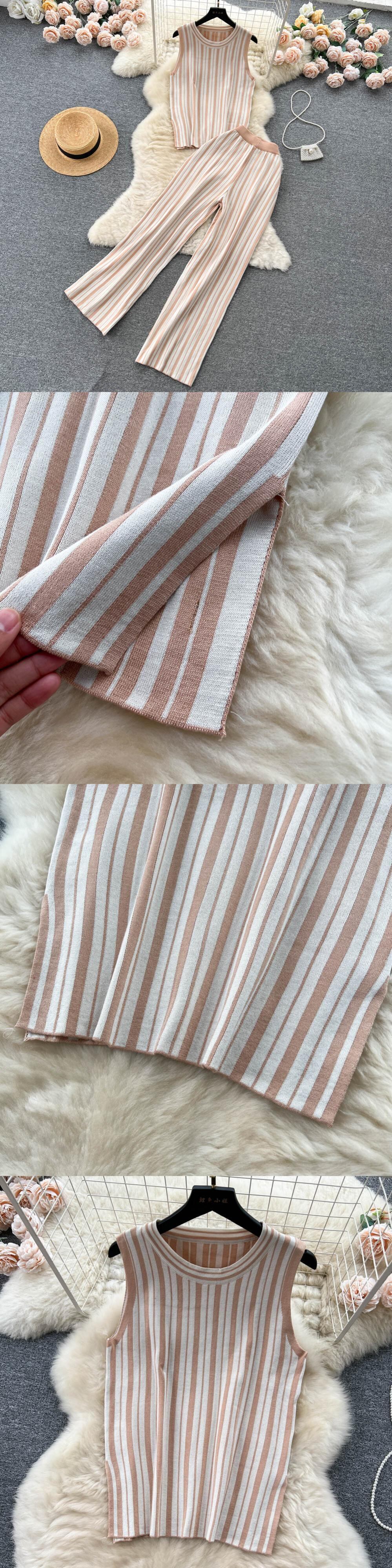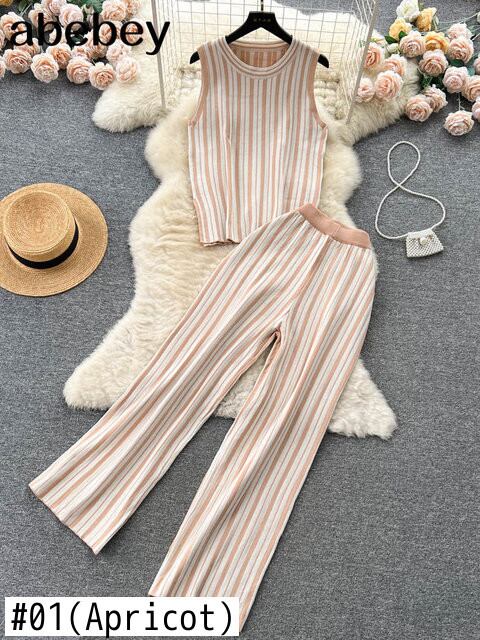 Striple O ネック春夏 T シャツセットノースリーブニットルーズツーピーストラックスーツレディースパンツスーツ スプリング 春物 サマー 夏物 Oネック Tシャツ