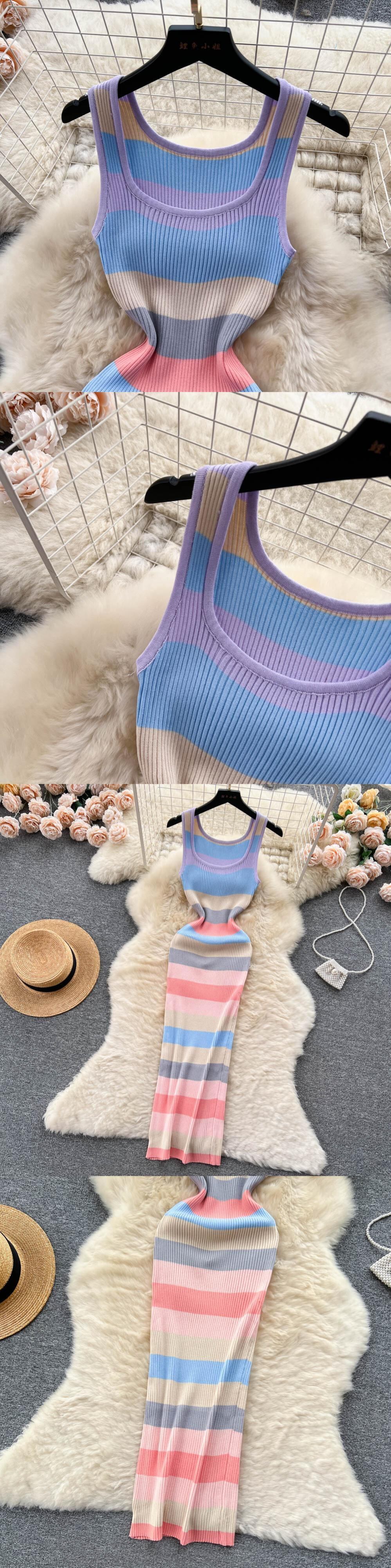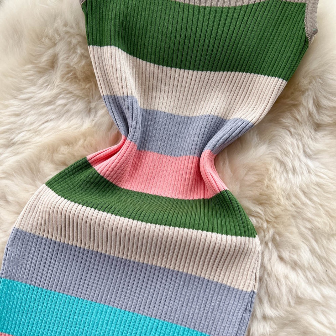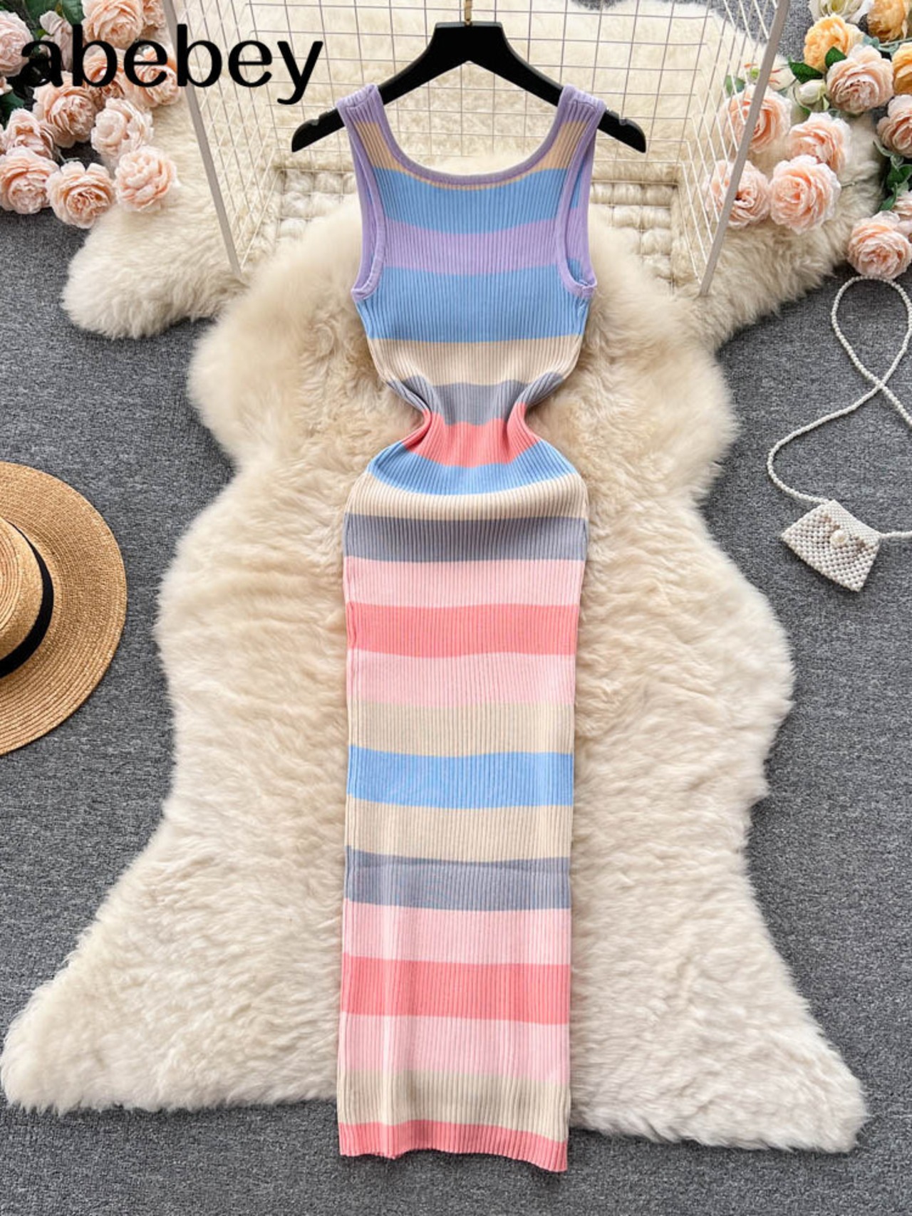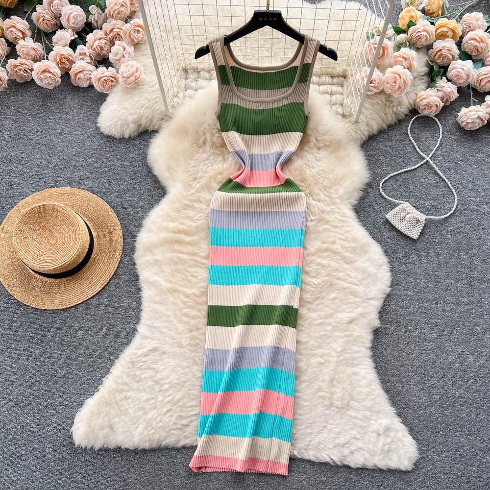 カラーサマーニットセクシーストラップドレスタンク弾性ウエストボディコンサンドレスビーチ背中開いたロングドレス 夏物