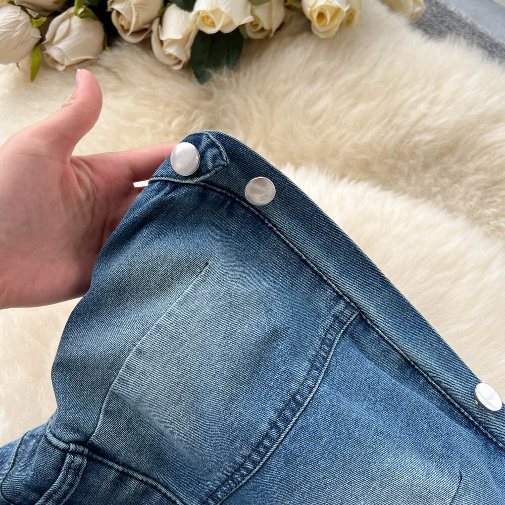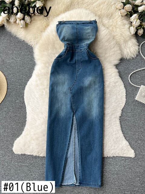 ブルーデニムドレス背中開いたロングドレスオフショルダーマキシドレス春ストラップレスグレースドレス スプリング 春物