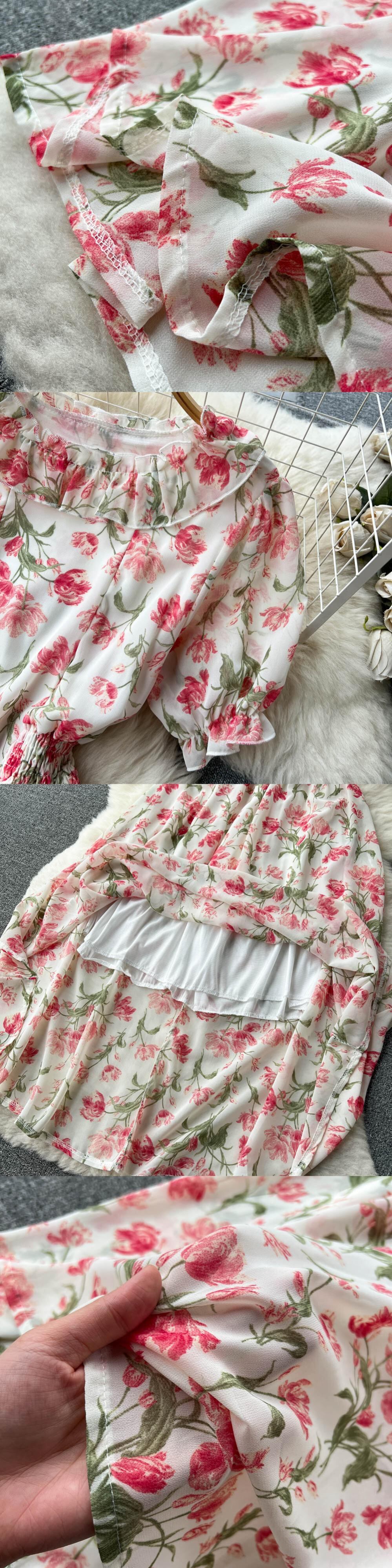 O ネック夏シフォンビーチロングドレス半袖シアー Hotsweet 花柄マキシサンドレス ショート ハーフスリーブ 大人ガーリー スウィート キュート カジュアル サマー 夏物