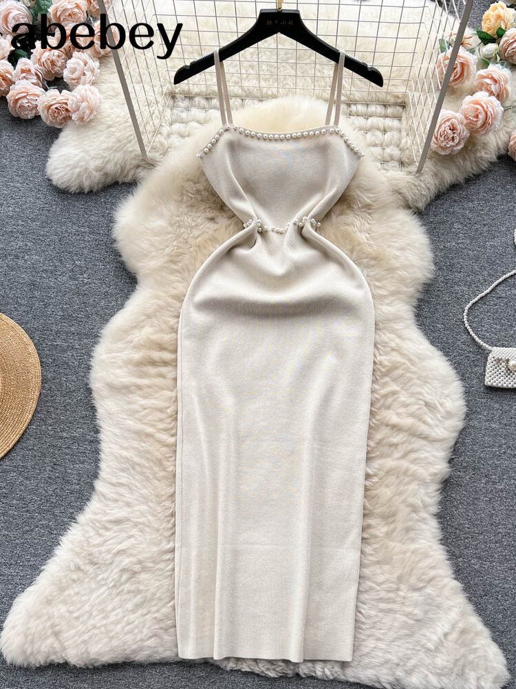 ビーズサマーニットセクシーストラップドレスタンク弾性ウエストボディコンサンドレスビーチ背中開いたロングドレス 夏物