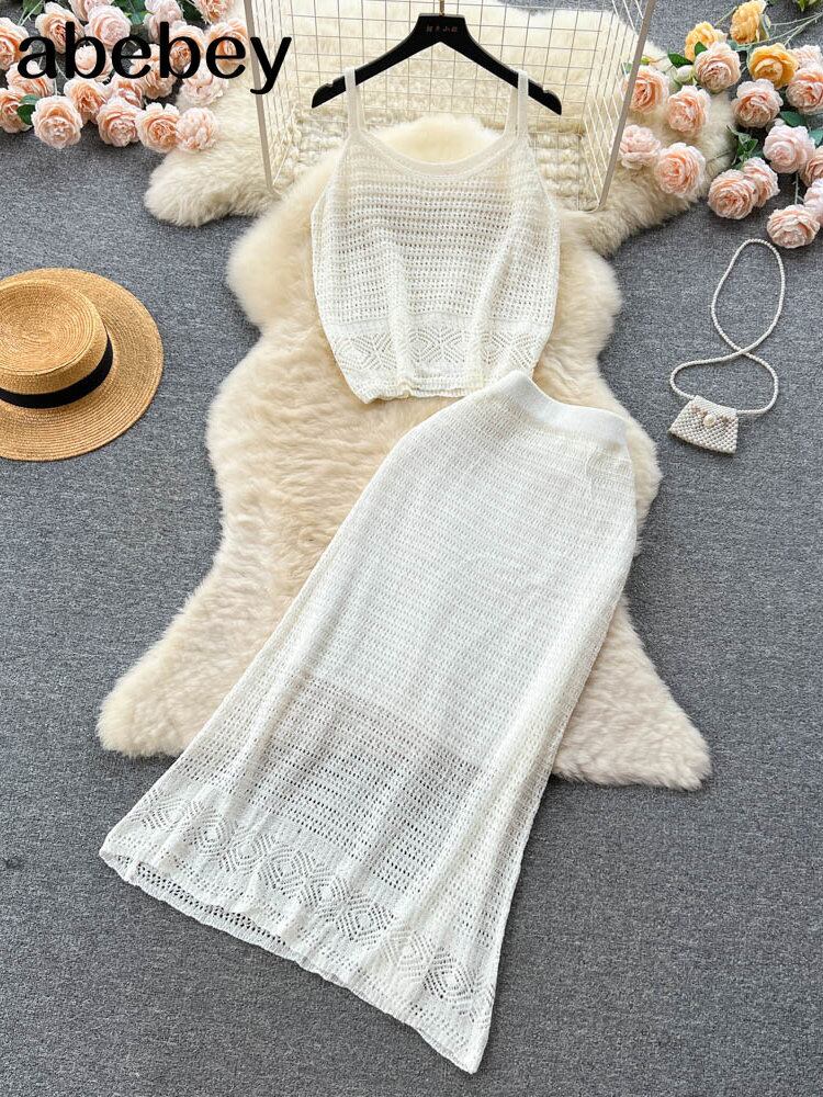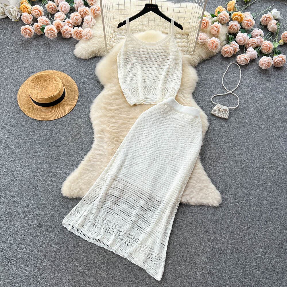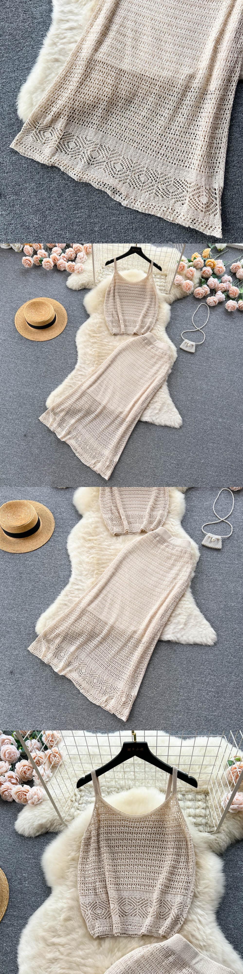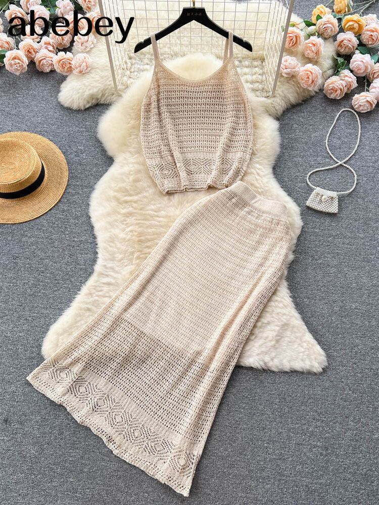 夏ニット 2 枚スーツ中空ストラップトップ + 弾性ウエストボディコンスカートストリートシニアセット エラスティック 伸縮 サマー 夏物