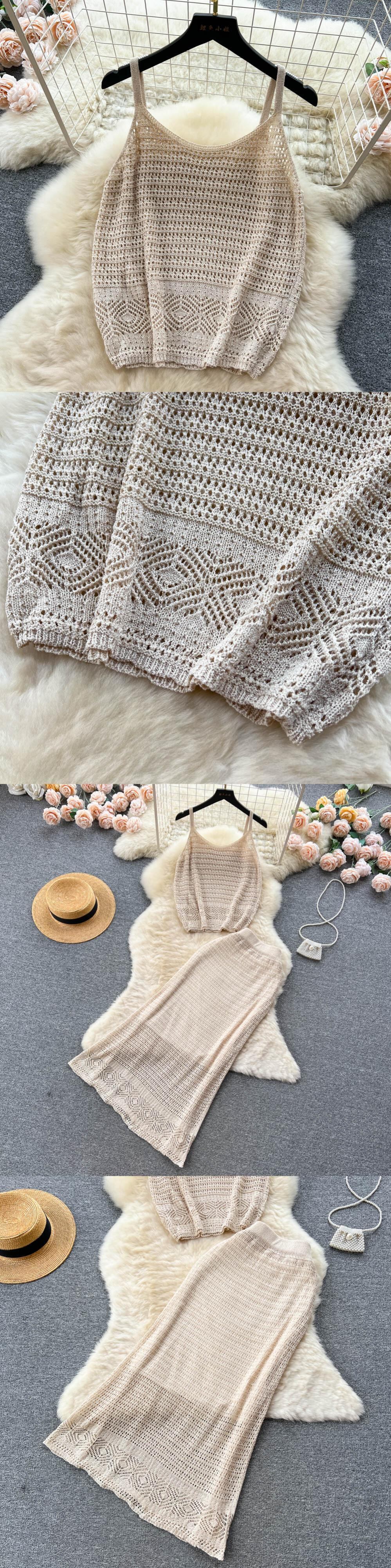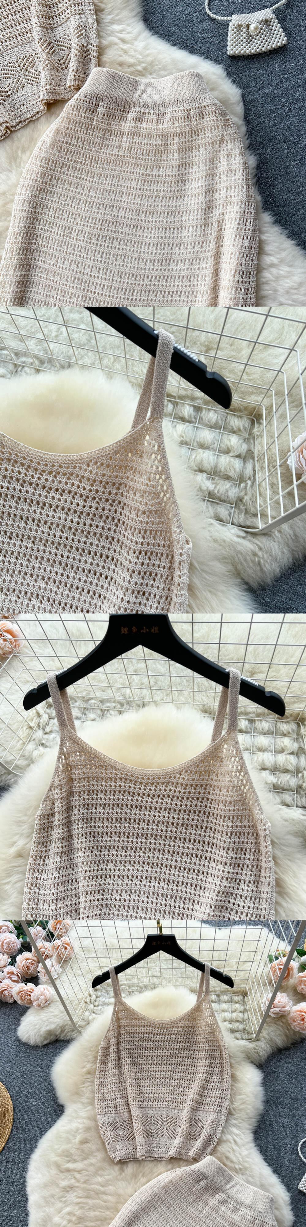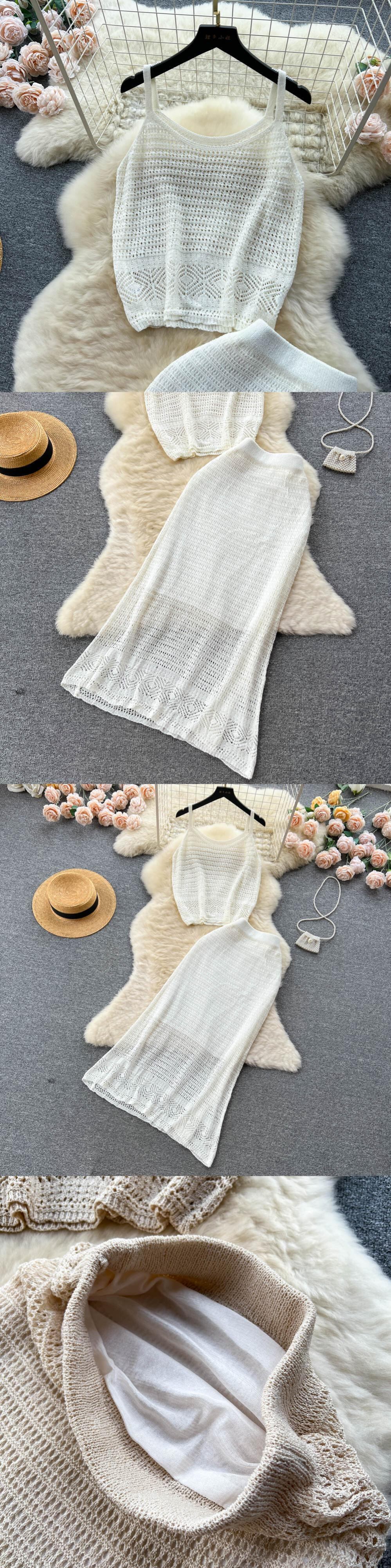 夏ニット 2 枚スーツ中空ストラップトップ + 弾性ウエストボディコンスカートストリートシニアセット エラスティック 伸縮 サマー 夏物