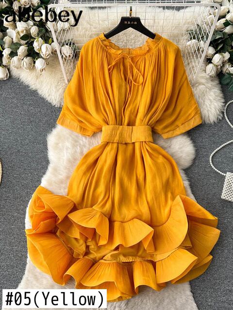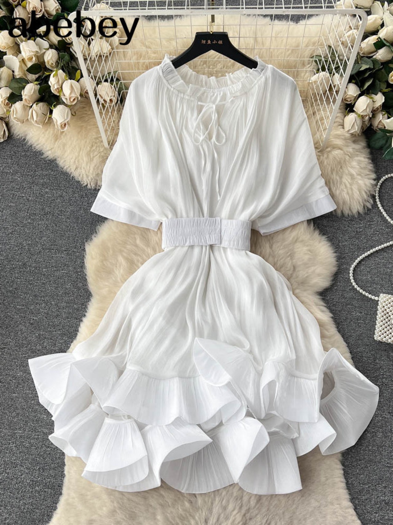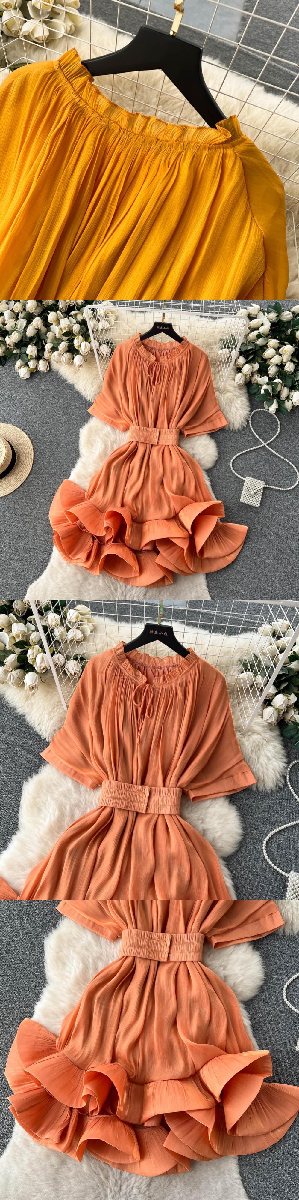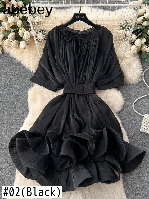 スリップドレスソリッド O ネック半袖フリルドレス夏スリムプリント Vestidos ショート ハーフスリーブ サマー 夏物 Oネック ソリッドカラー