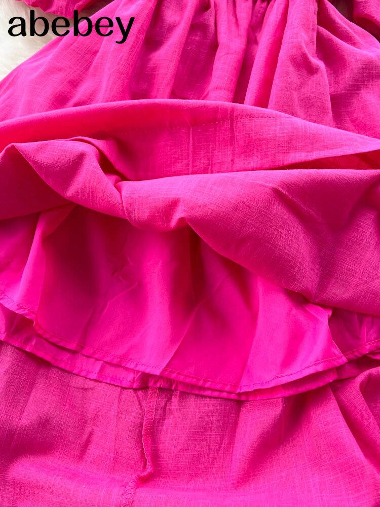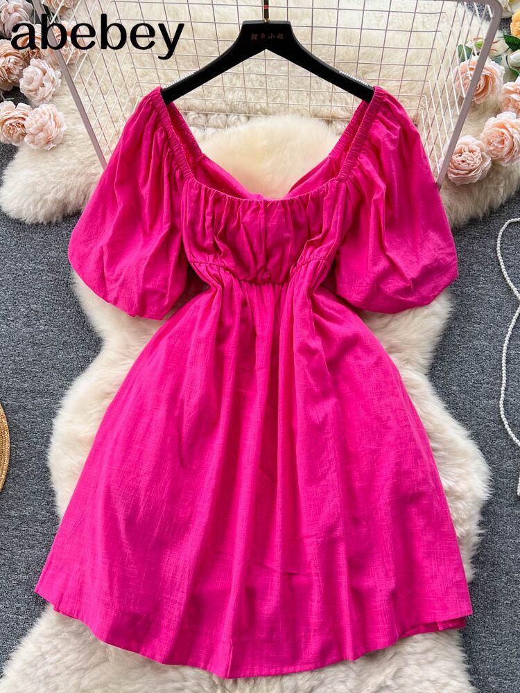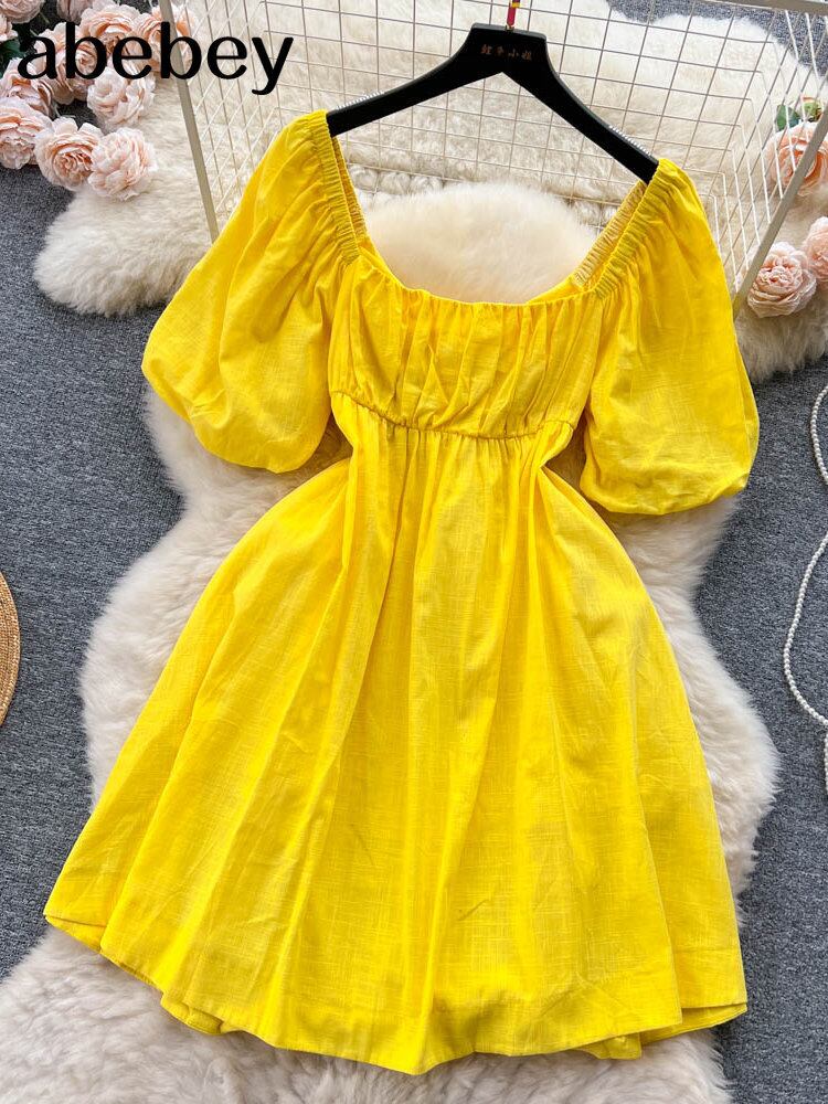夏シャーリング弾性ボヘミアンロングドレススクエアネック半袖Aラインビーチサンドレスミディドレス ショート ハーフスリーブ エラスティック 伸縮 サマー 夏物 ソリッドカラー スクウェア