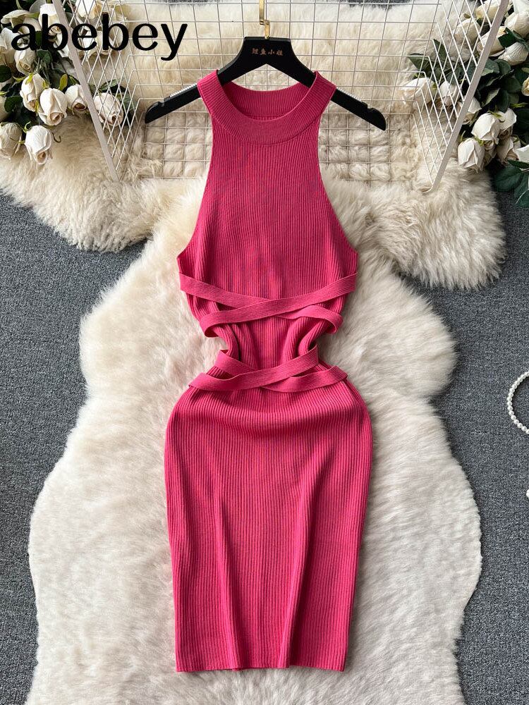 インソリッドニットドレスサマーホルターノースリーブボディコンドレスヨーロッパスタイルオフィスドレス 夏物 ソリッドカラー 会社 学校 通勤や通学にも