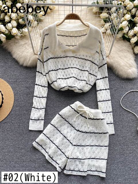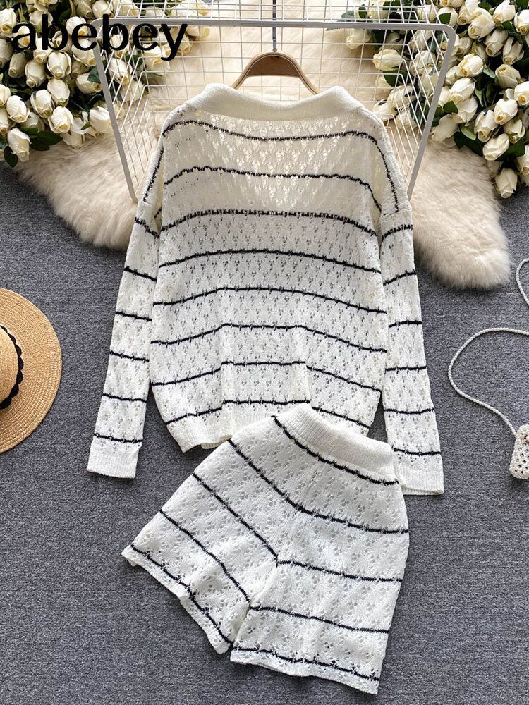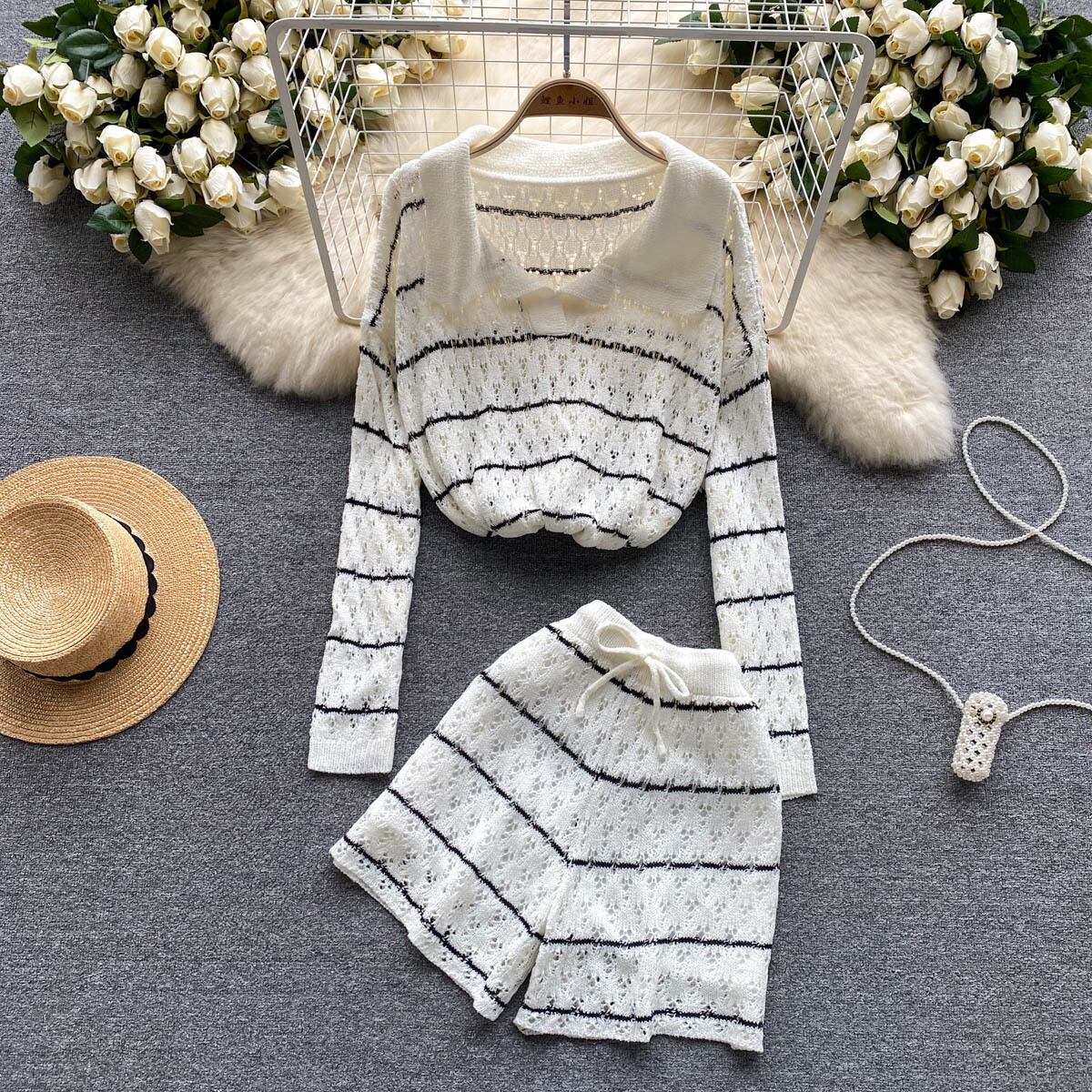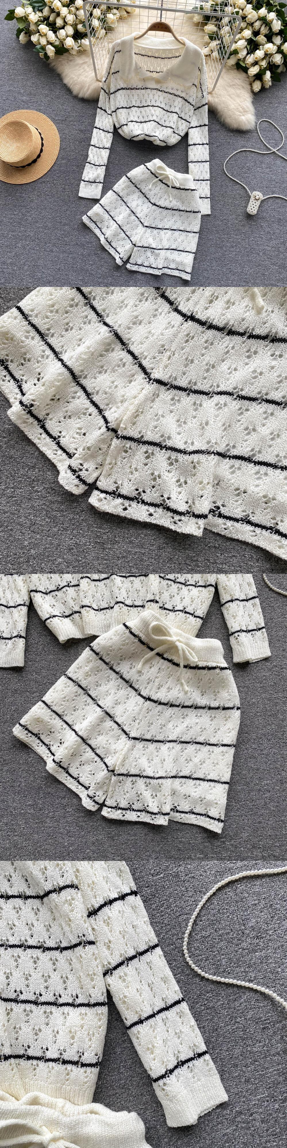 ルーズサマーニットレディースパンツツーピースセットストリップ長袖ニットワイドレッグショーツセットスーツ ロング 夏物 ブルマー ワイドパンツ