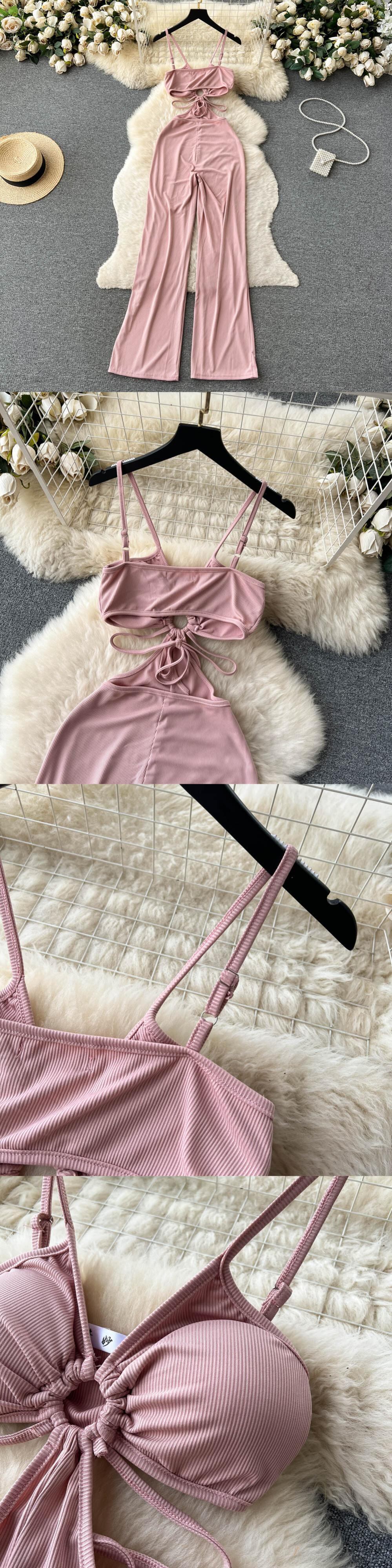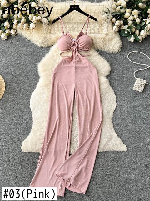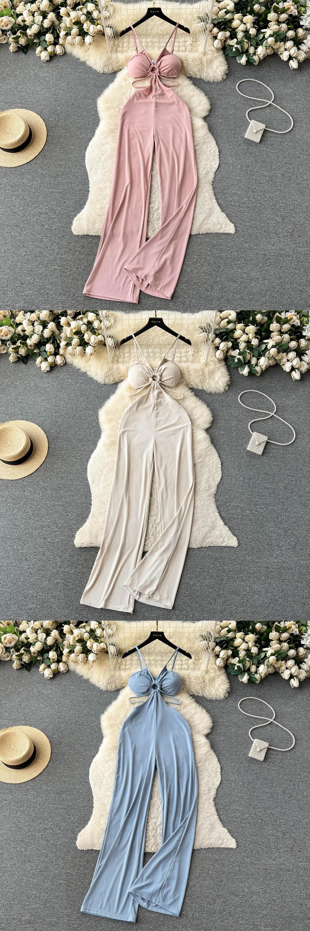 中空アウトセクシージャンプスーツ夏ストラップスリムスポーティスーツワイドレッグパンツ背中開いたビーチロンパース サマー 夏物 ワイドパンツ ソリッドカラー