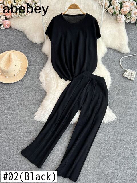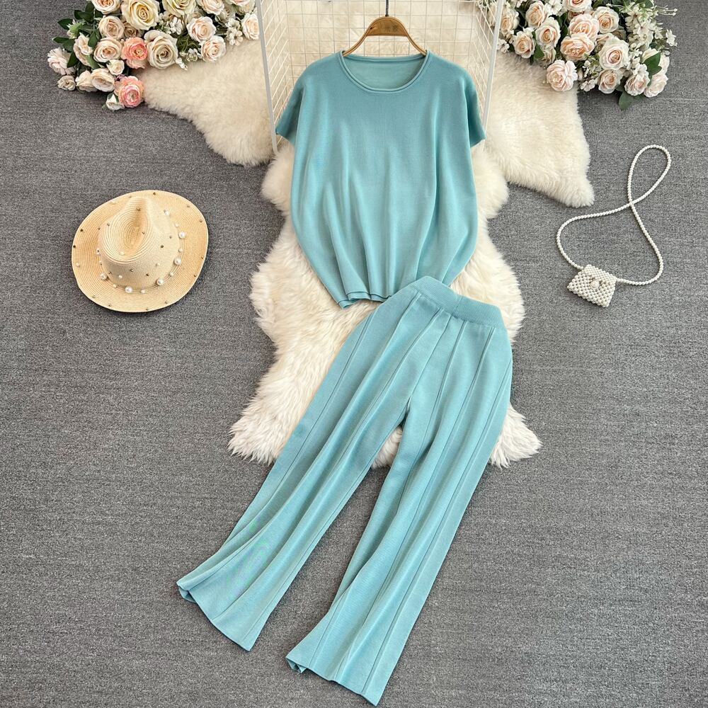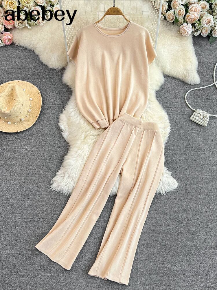 基本的 o ネック春夏 T シャツセットニットルーズツーピース半袖トラックスーツレディースパンツスーツ ショート ハーフスリーブ スプリング 春物 サマー 夏物 Oネック Tシャツ