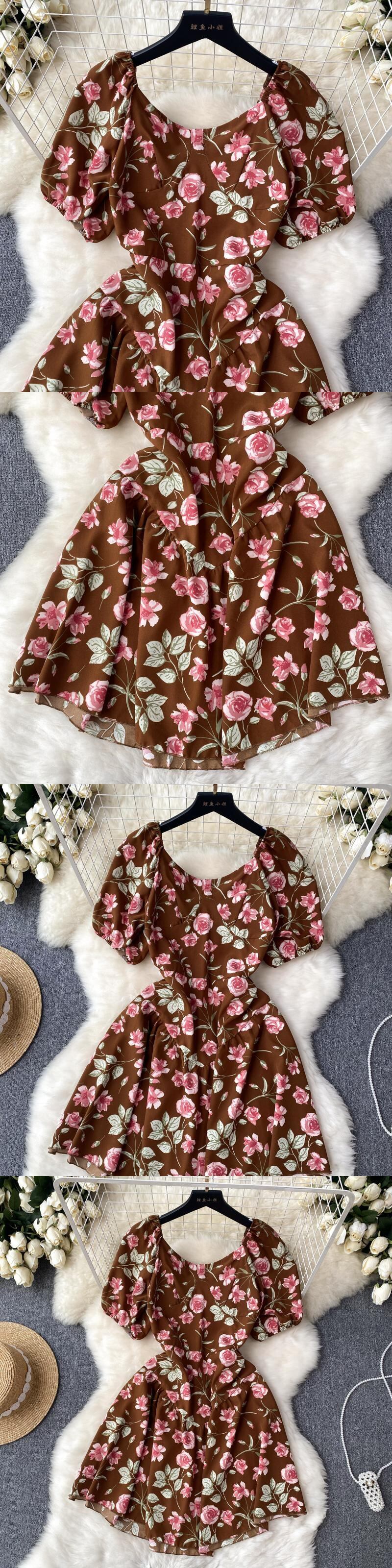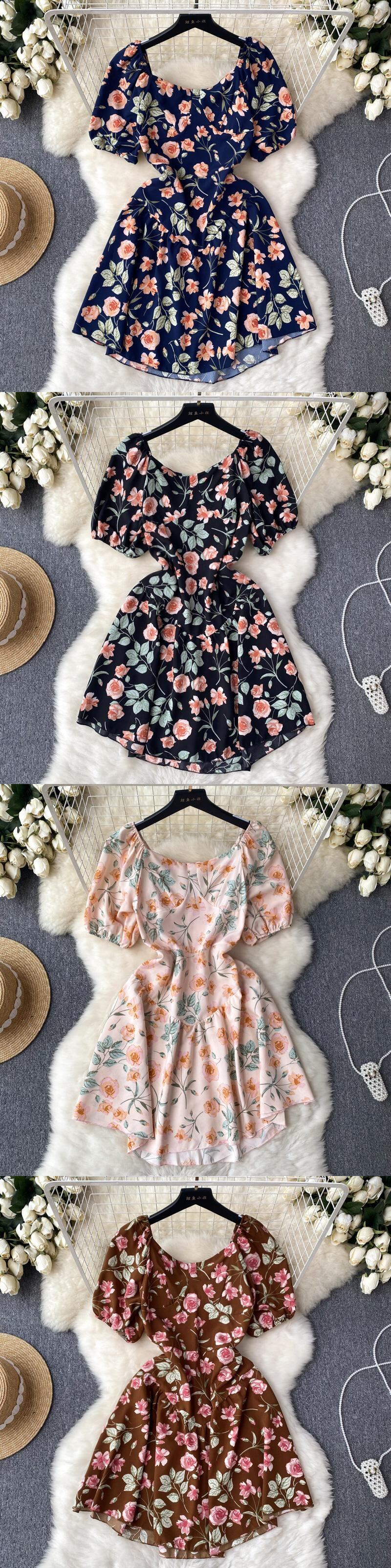 夏甘いプリントミニドレススクエアネック A ライン弾性サンドレスシャーリング花ビーチショートドレス エラスティック 伸縮 大人ガーリー スウィート キュート カジュアル サマー 夏物 花柄 Aライン