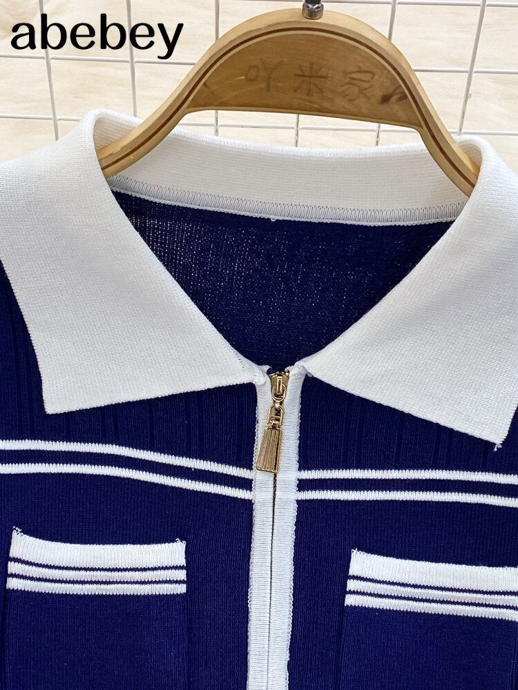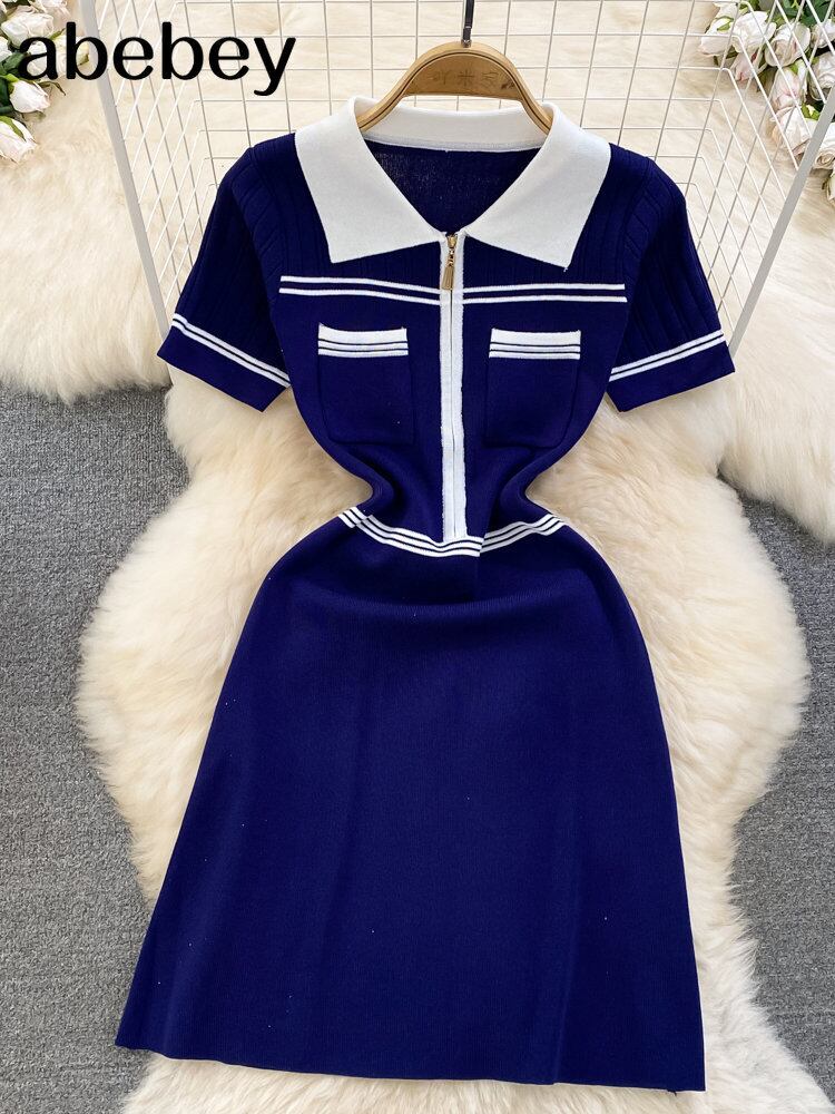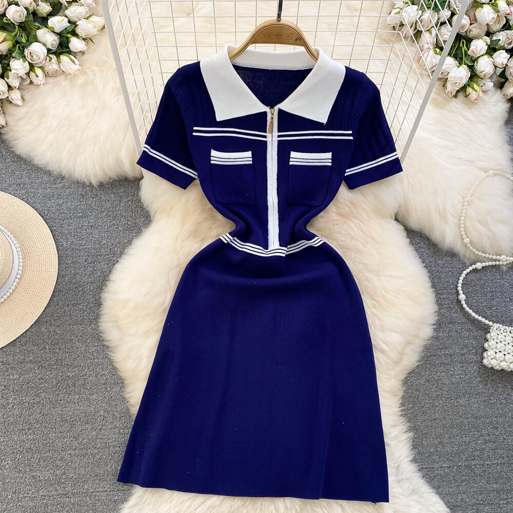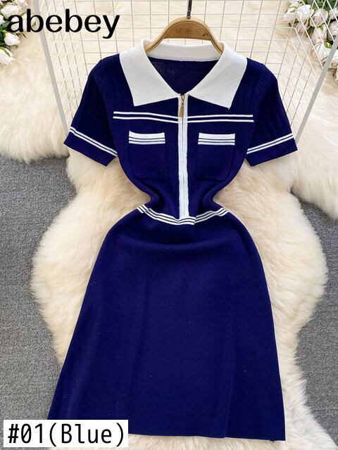 ニットルーズドレスターンダウン襟半袖ストリップ弾性ストリートスタイルマキシサンドレス ショート ハーフスリーブ エラスティック 伸縮 ソリッドカラー