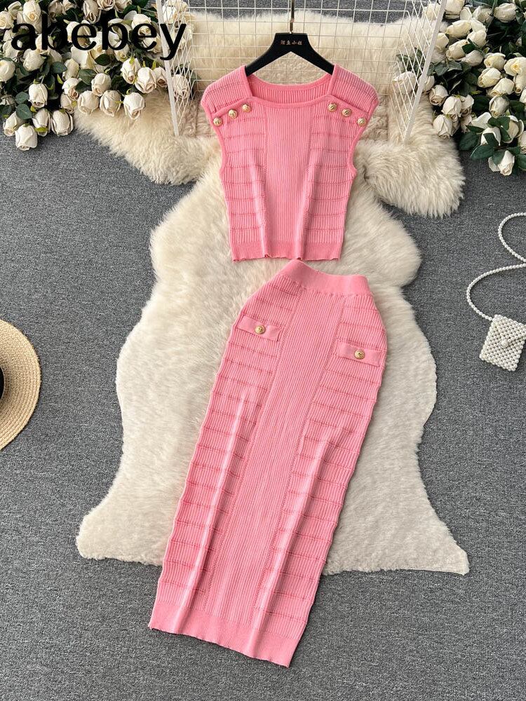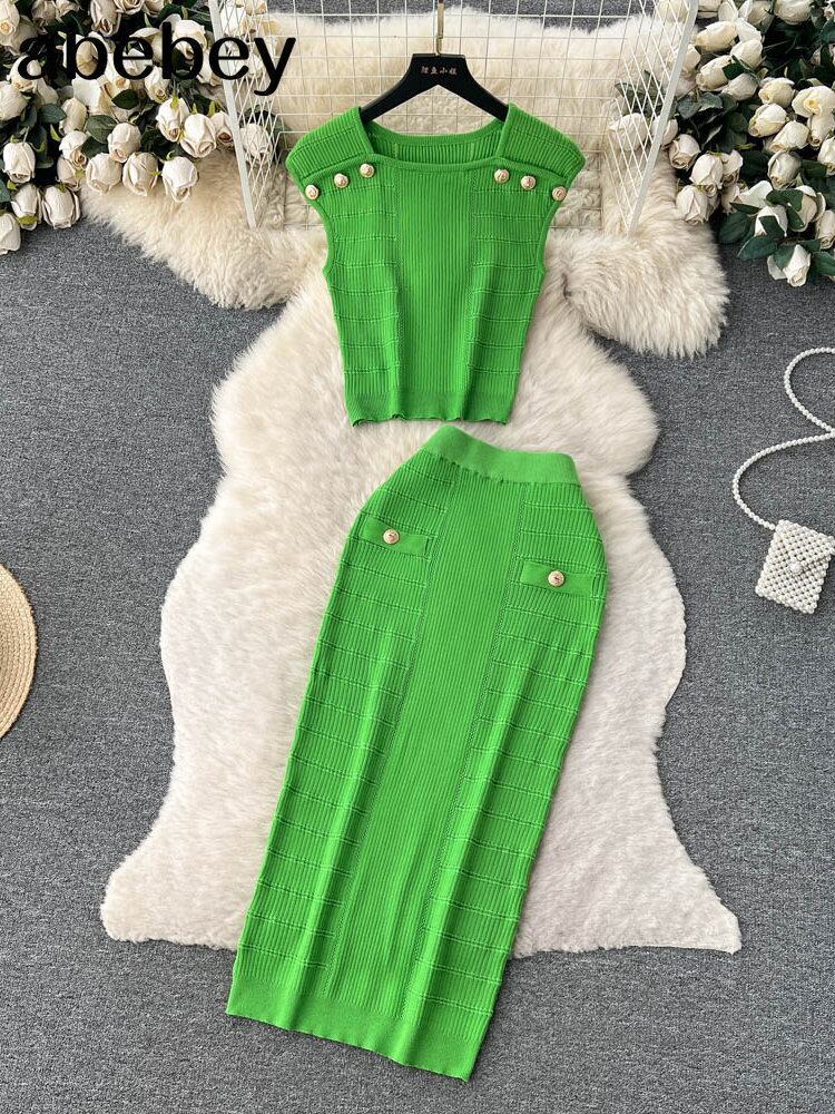 ニット白夏 2 ピースボタンクロップトップタンクスリットミディロングスカートセットボディコンセクシーパーティー衣装 ホワイト サマー 夏物 ソリッドカラー