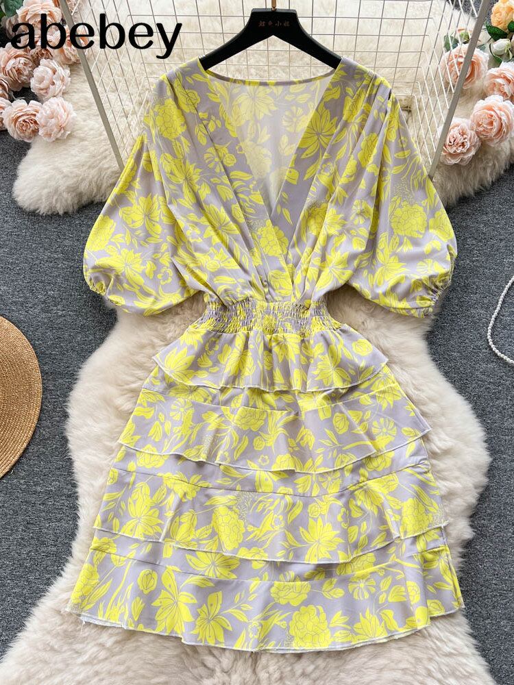 セクシー V ネックミニドレス夏自由奔放生きる花柄バットウィングスリーブドレスフリルビーチパーティードレス Vestidos サマー 夏物 Vネック