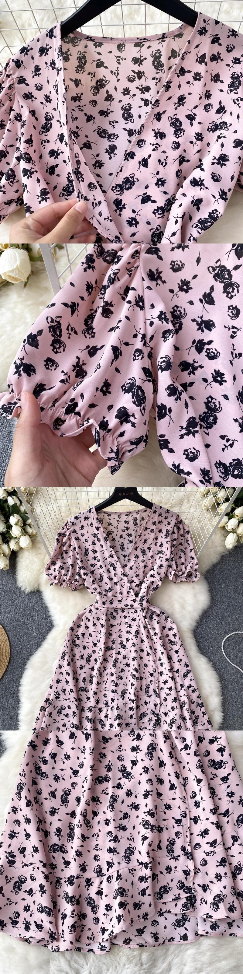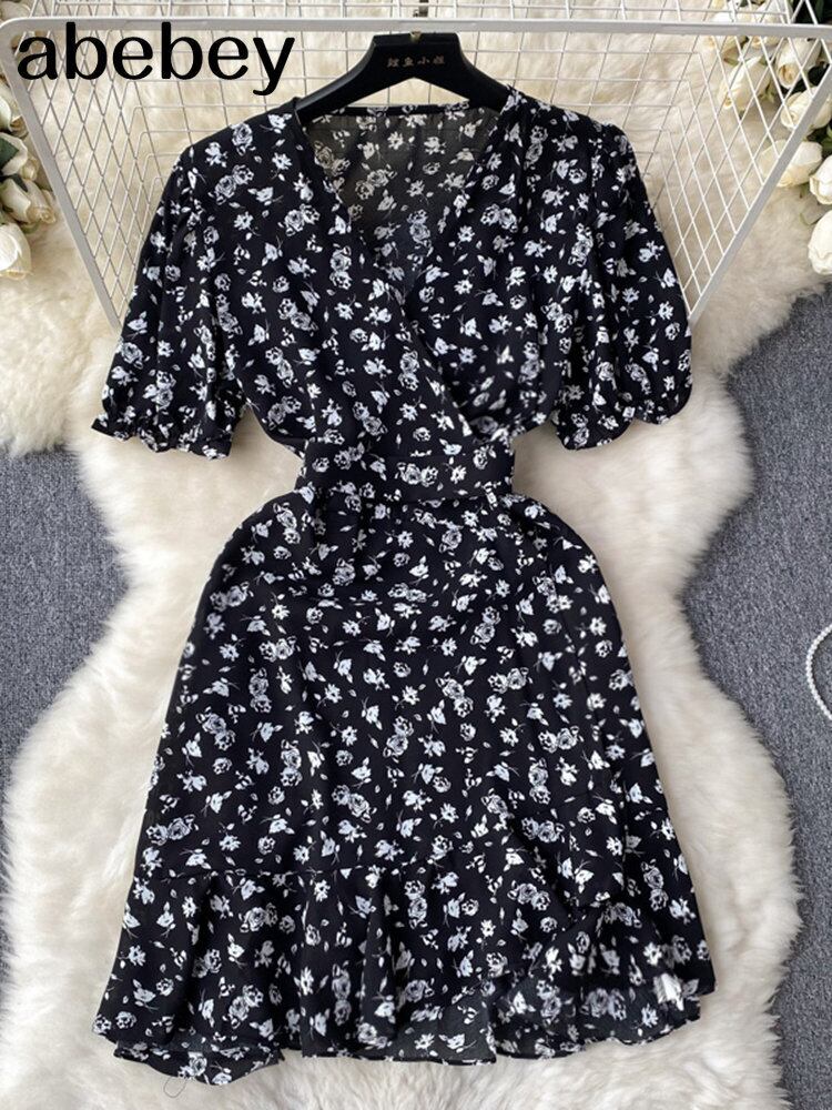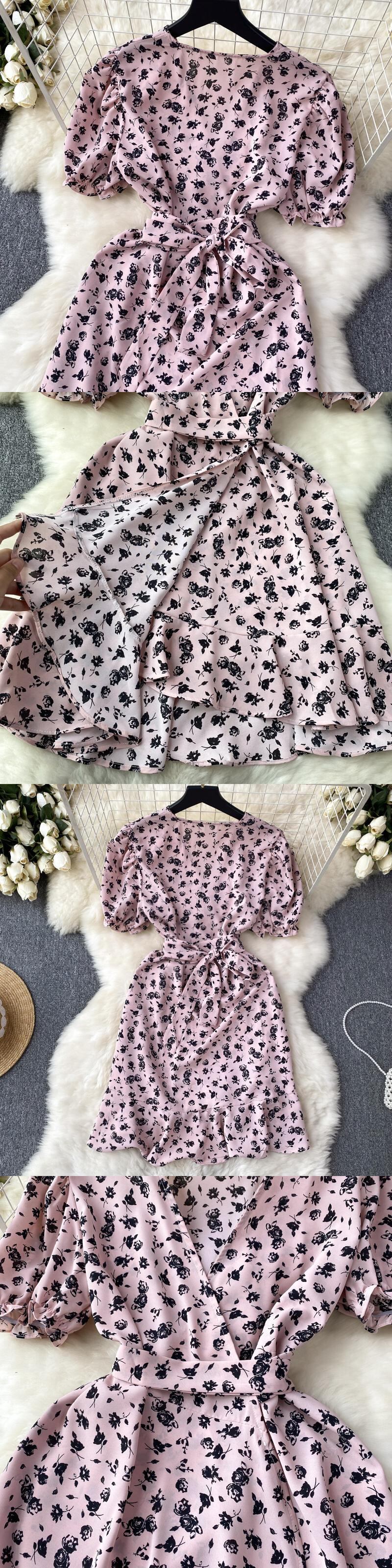 フレンチスタイルシフォンプリントサンドレス半袖シックビーチロングドレス夏ホットスウィートボヘミアンミニドレス ショート ハーフスリーブ 大人ガーリー キュート カジュアル サマー 夏物