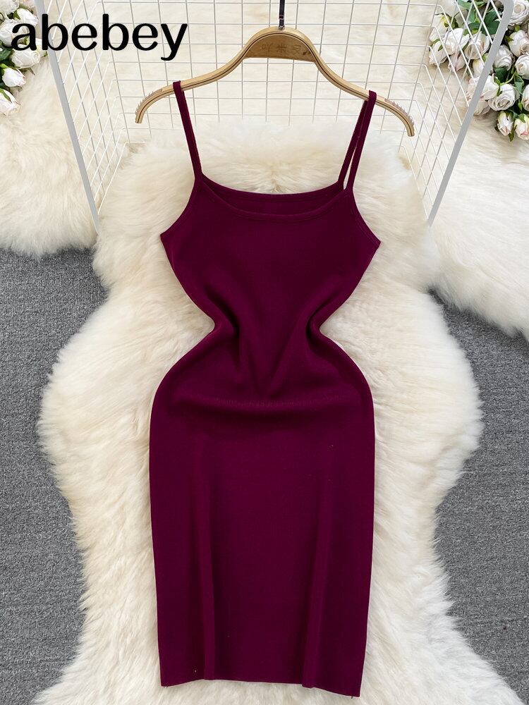 ショートサマーニットセクシーストラップドレスタンク弾性ウエストボディコンサンドレスビーチソリッドバックレスロングドレス 夏物 ソリッドカラー