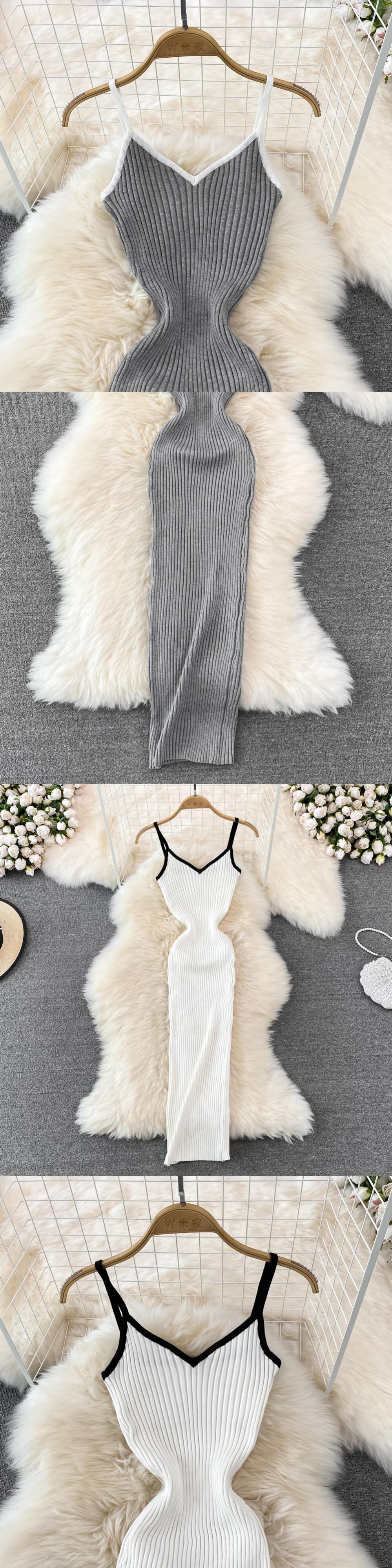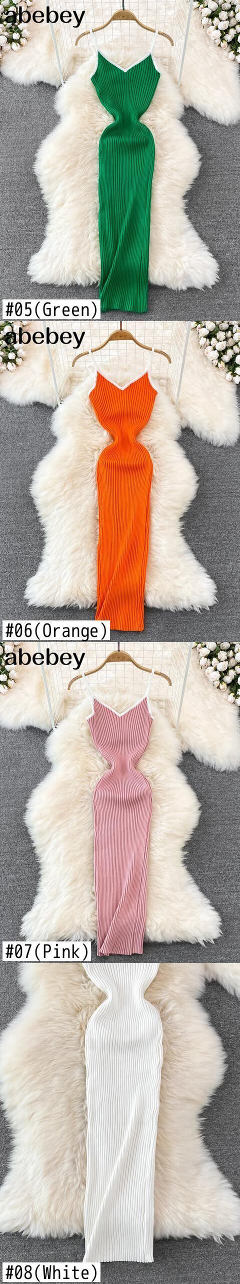 サマーニットセクシーストラップドレスタンク弾性ウエストボディコンサンドレスビーチスプリットバックレスロングドレス 夏物