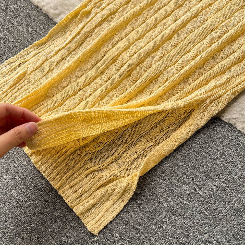 黄色夏休みニットビーチセットストラップキャミソール+弾性ウエストロングスカートボヘミアン中空アウト2枚スーツ エラスティック 伸縮 サマー 夏物