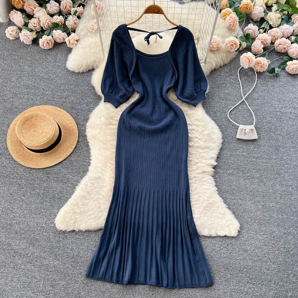 ニットドレス夏気質包帯パフスリーブヒップロングドレス A ラインドレス Vestidos サマー 夏物 Aライン ソリッドカラー