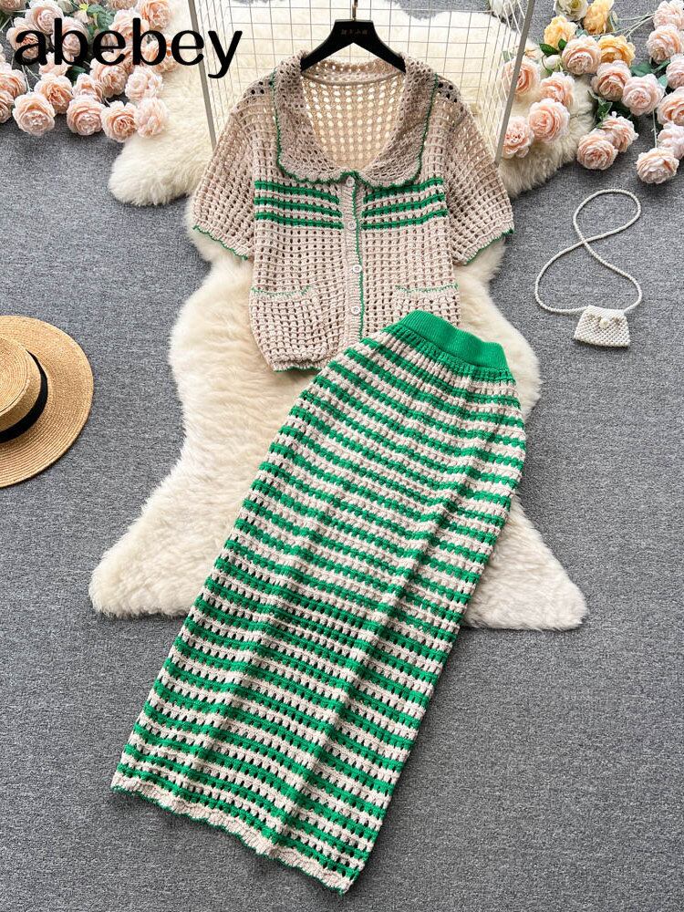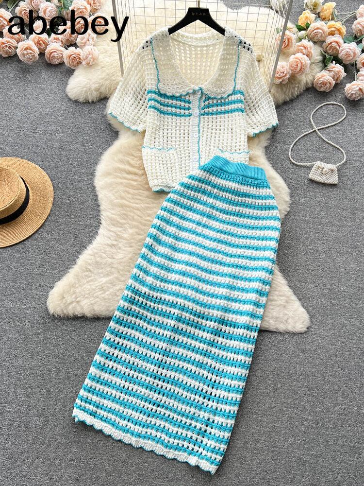 ニット 2 枚スーツ V ネック中空アウトカーディガントップ + 弾性ウエストボディコンスカートストリートセット エラスティック 伸縮 Vネック