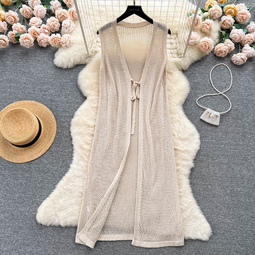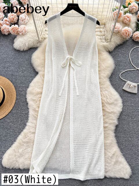 ノースリーブニットドレス夏弾性ウエスト V ネック中空ロングドレス エラスティック 伸縮 サマー 夏物 Vネック