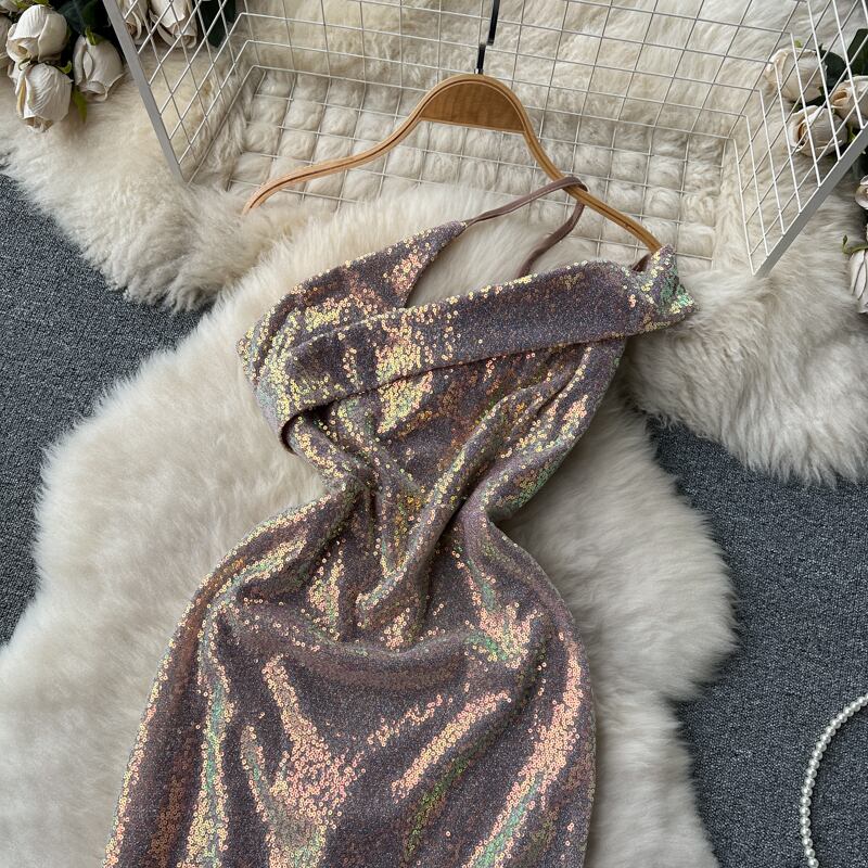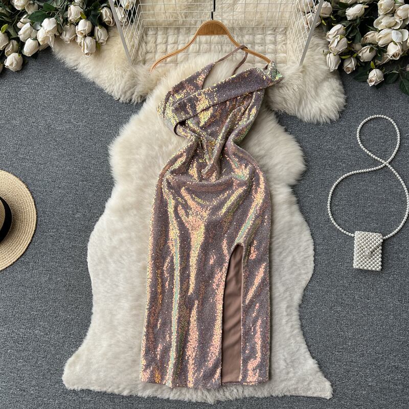スパンコールドレスセクシーワンショルダー Y2k ゴールドナイトパーティー誕生日マキシドレスリボンレディース衣装ラップ胸 Vestidos