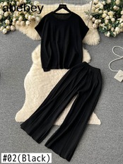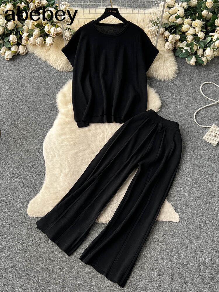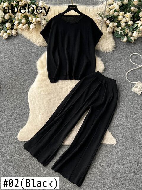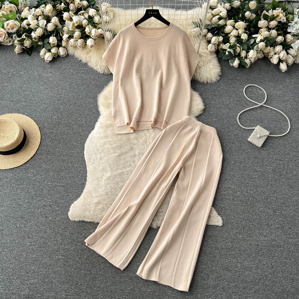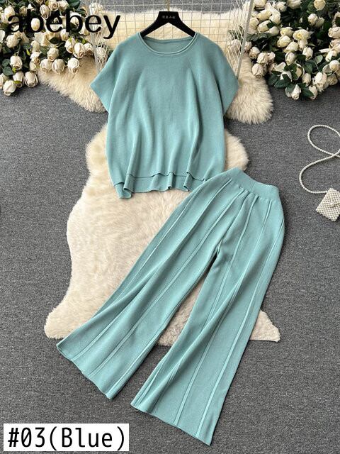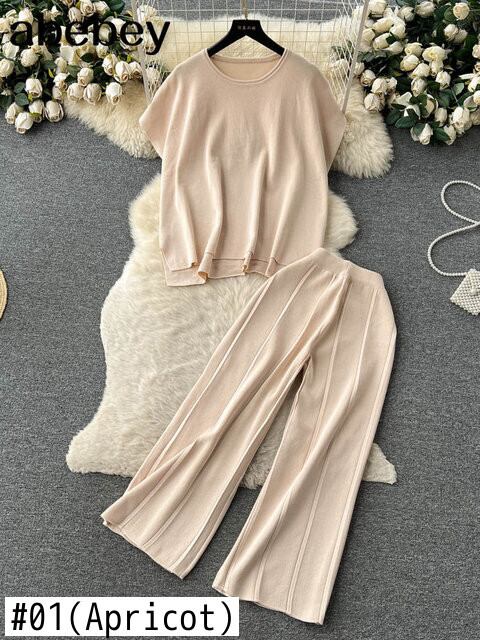 パンツ 2 点セット夏 O ネックノースリーブニットトップスウエストワイドレッグロングパンツトラックスーツ サマー 夏物 Oネック ワイドパンツ
