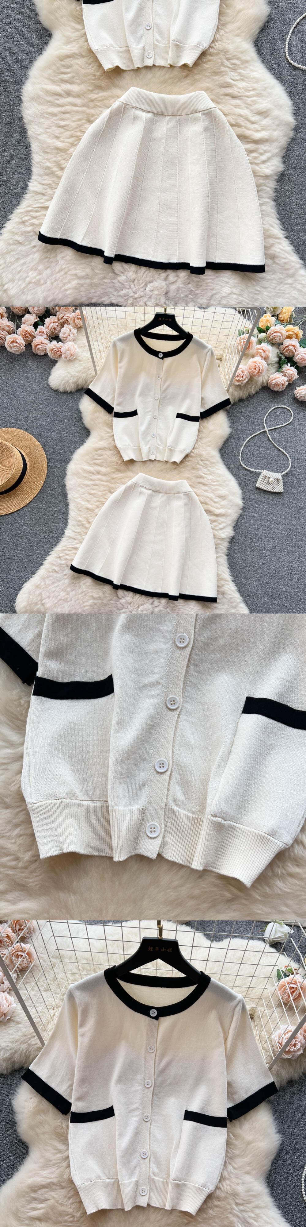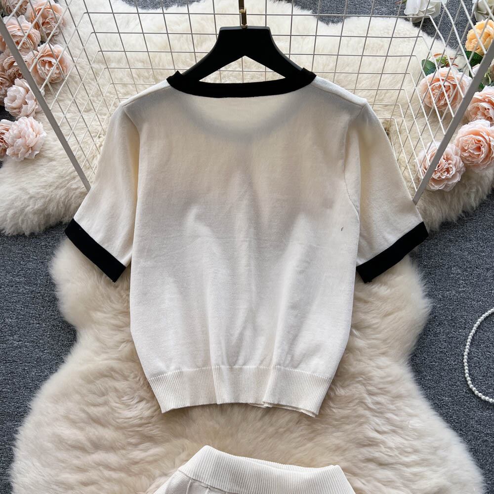 パッチワークニットウェア 2 個スーツシックとニットツーピースセット半袖トップとスカートセット衣装 ショート ハーフスリーブ